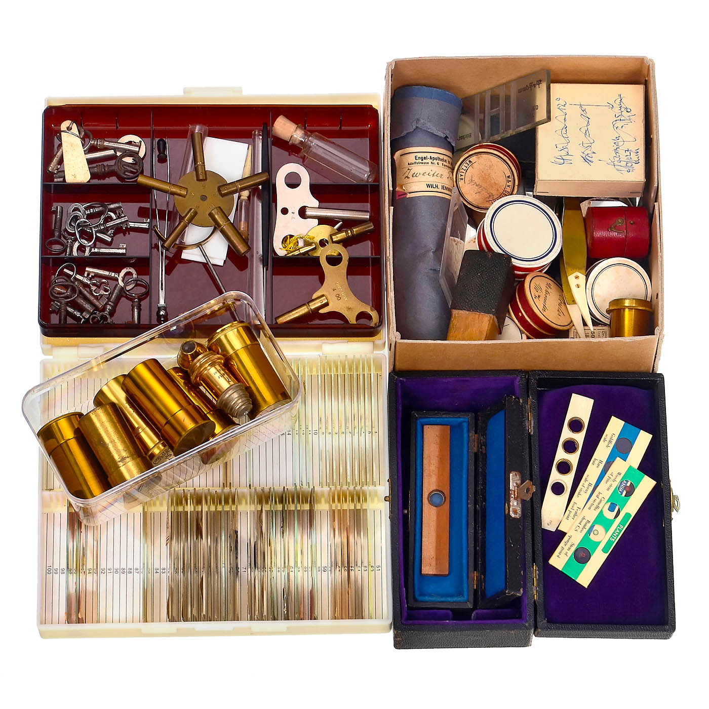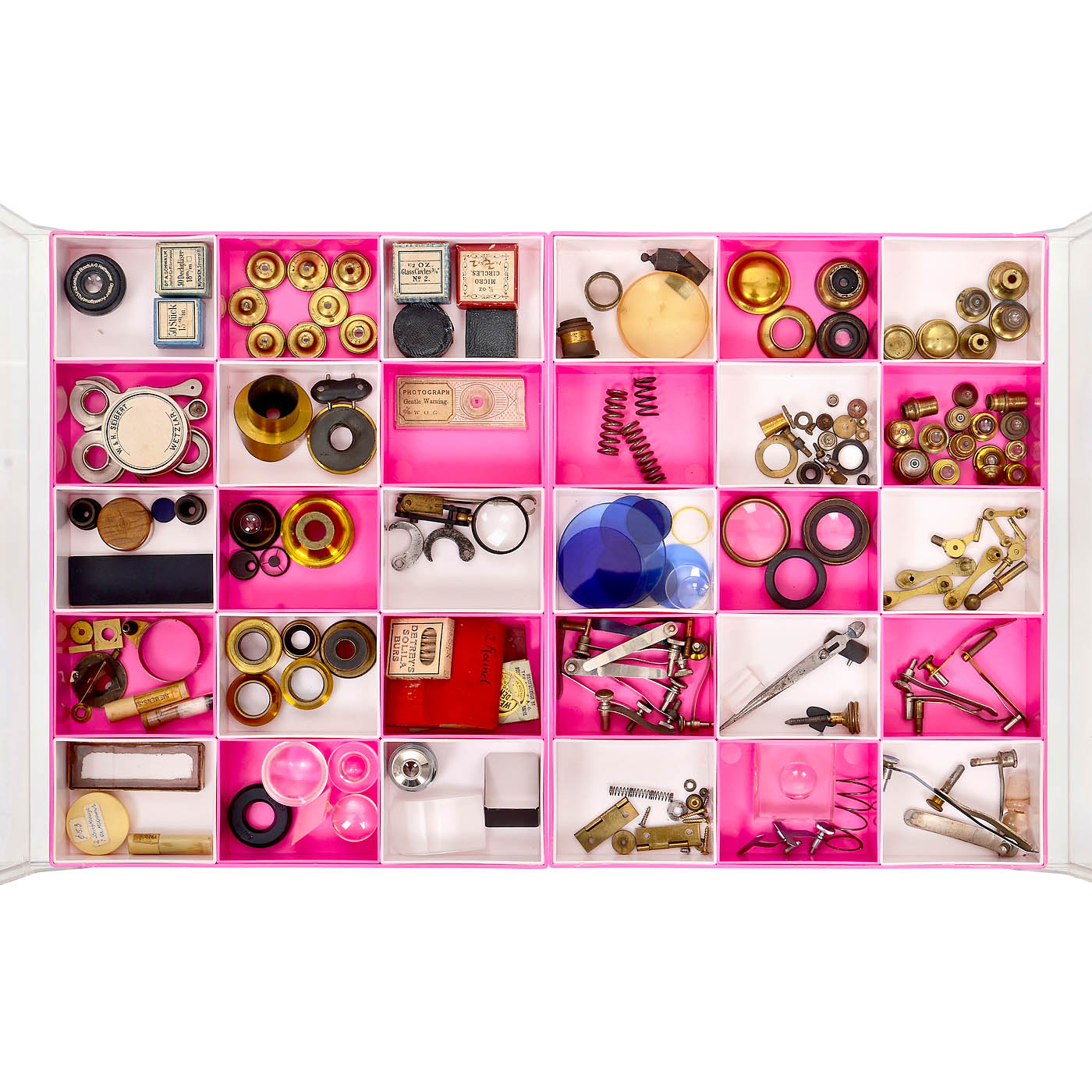 1) Microphotograph "Gentle Warning" by William Overend Geller (W.O.G.), c. 1855, glass on the right side broken, photograph undamaged. – 2) 35 early preparations, loose in cardboard box. – 3) Cardboard box with 5 trays, England, with 37 slides by "W.A. Rogerson" and others. – 4) Cardboard box in book form, c. 1900, containing 49 microscopic specimens by "Heinrich Boecker from Wetzlar". – 5) 50 recent microscopic specimens in plastic box. – 6) 25 eyepieces from Zeiss and other manufacturers. – 7) Approx. 300 lens blanks, various shapes and diameters. – 8) Lens Emil Busch Glyptar Anastigmat 3.5/3.5 cm. – 9) Approx. 50 objective lenses, mostly brass-framed, c. 1875–1920. – And: 10) Many more parts: Stage clamps, case keys, revolver nosepieces, mirrors, glasses, prisms and other.