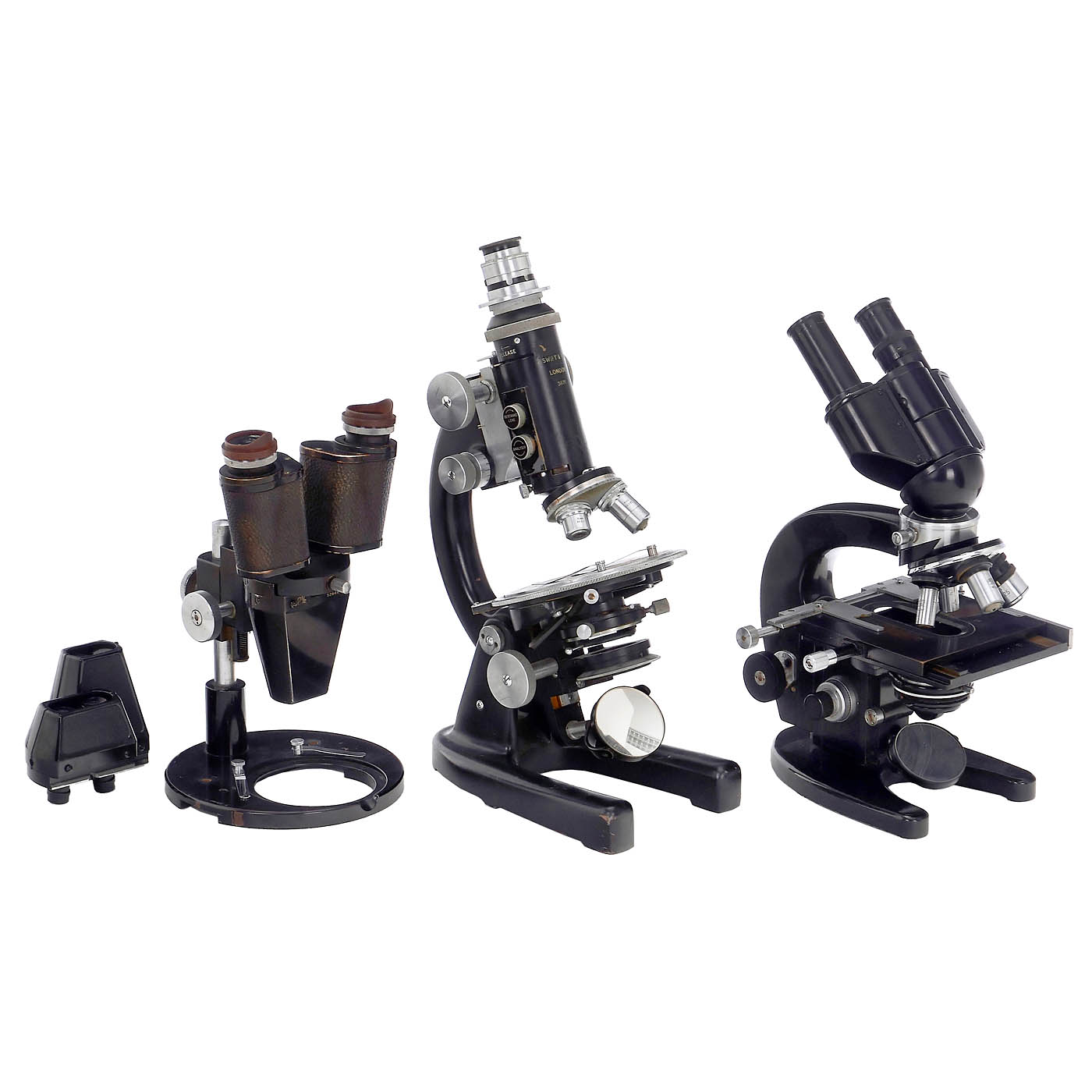 1) Microscope, Carl Zeiss, Jena, model LgOG1, c. 1965, no. 139961, binocular tube, quadruple nosepiece, condenser, double mirror, with 4 objectives and 2 eyepieces in case, all drives running smoothly, height 32 cm. – 2) Polarizing microscope, J. Swift & Son Ltd, model P, c. 1955, serial no. 31171, with double mirror, condenser, iris diaphragm, rotating stage, triple nosepiece, rotating pre-centred Bertrand lens and analyser, mechanism somewhat resinous, height 37 cm, in wooden case. – And: 3) Stereo microscope, Carl Zeiss, Jena, model PN XVI Stemi, c. 1955, with pair of eyepieces K7x and 3 stereo objectives, in wooden case.