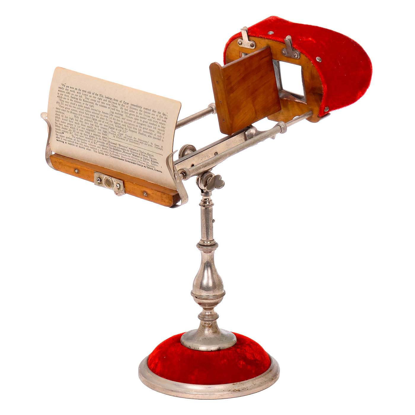 Gustav Schneck, USA. Patent no. 318302, stamped patent date 19 May 1885, the patent relates to focusing with a rack-and-pinion drive to the lens holder and object holder, a unique process for Holmes-type stereo viewers, for stereo cards 9 x 18 cm, nickel-plated metal body, base and eyecups covered with velvet, total height 13 1/3 in., with one stereo card "The Statues of Thebes", in very good working order, original condition, very rare, we are only aware of one other example.