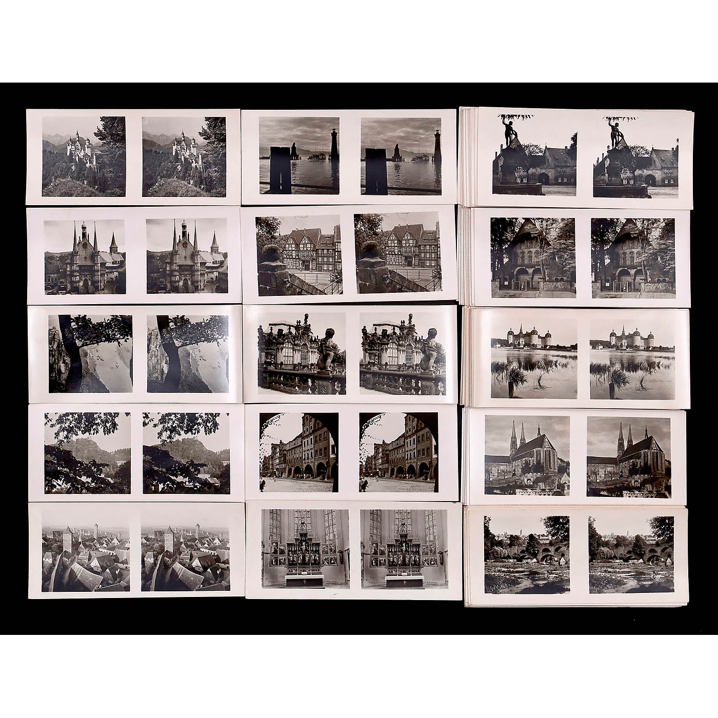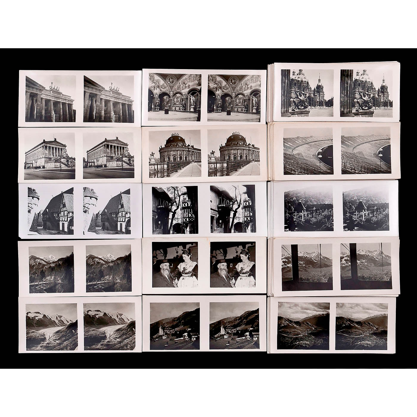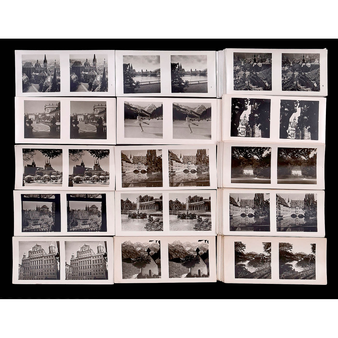 Sch?nstein, Oberaudorf. All approx. 370 stereo cards in 6 x 13 cm format with reverse printing, mostly in German/English, in good condition, without boxes. 1) Beautiful Homeland, cultural monuments, cities, landscapes of the states of Northwest Germany 1–24. – 2) Beautiful Homeland, cultural monuments, cities, landscapes of the states of Southern Germany I–XXI. – 3) German Homeland Series I 1–30 (including Weimar). – 4) German Homeland Series I 1–30, some with different images in different numbers. – 5) German Homeland Series II 1–30 (30 = Bremen). – 6) German Homeland Series II 1–30, some with different images in different numbers (30 = Aachen). – 7) German Homeland Series III 1–30. – 8) German Homeland Series IV 1–30. – 9) Unforgettable Homeland – Silesia 1–15. – 10) Rothenburg ob der Tauber 1–15. – 11) Berlin – Potsdam 1–30 (2 = Schwerin Palace). – 12) Berlin – Potsdam 1–27, partly different pictures (2 = old library) – 13) Quiet Corners in the Palatinate 1–15. – 14) Across Upper Bavaria 1–33. – And: 15) The Grossglockner Road 1–15. – Very rarely found individually, a great rarity!