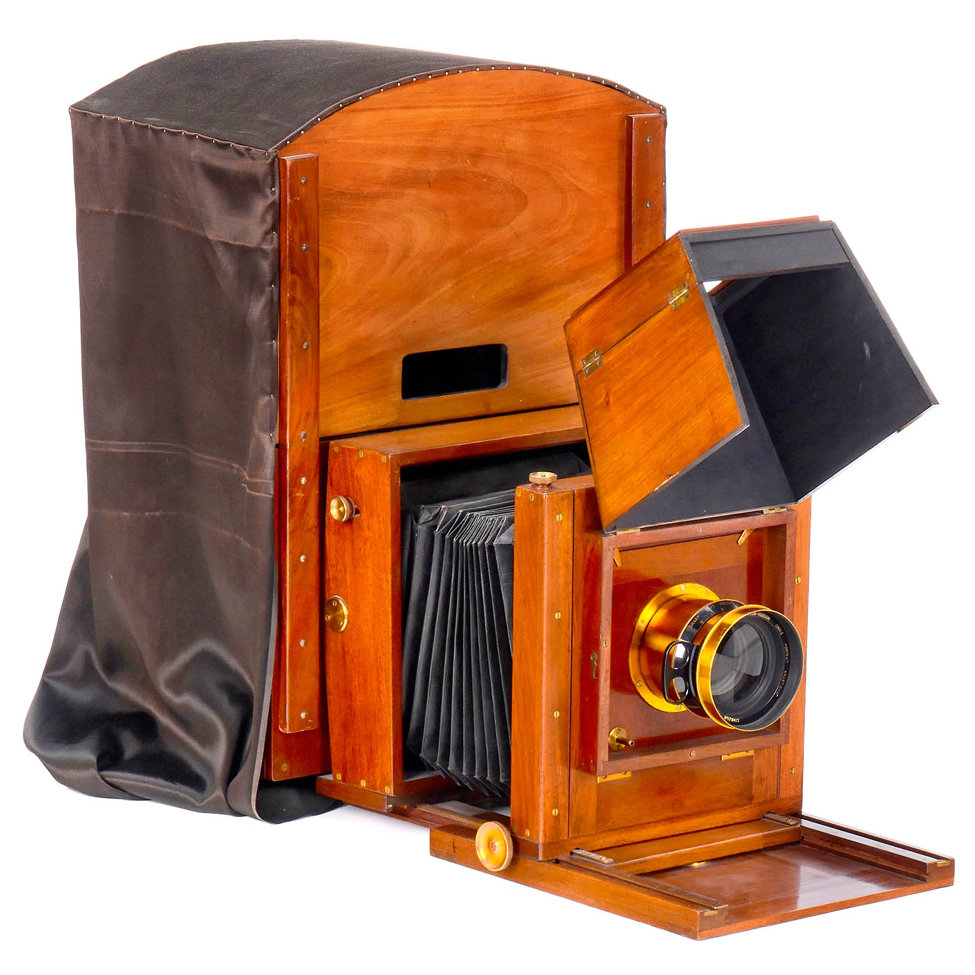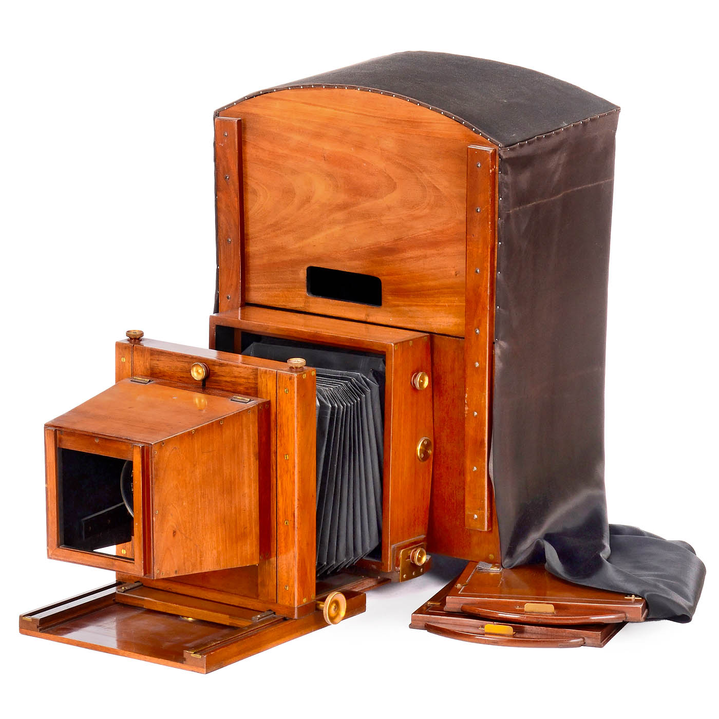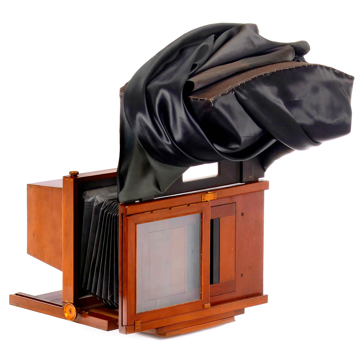 Fallowfield, England. Mahogany with brass fittings, special model with cloth holder incorporating a viewing slit for checking the exposure. Sliding front standard with hinged light-shielding hood of the same mahogany, featuring a holder for effect lenses at the very front. Equipped with a Taylor-Hobson Cooke Portrait Anastigmat Series IIB 4.5/12 ? inch lens, no. 178415, smooth soft-focus and aperture adjustments. Glass under point light: minimal age-related deposits between the front elements, otherwise clean. Dimensions: 36 x 30 x 37 cm (68 cm with hood). Black leather bellows with some tears along the edges. The back of the camera swivels on two axes, with a quick-change slide, removable reducing inserts in the back from a maximum of 22 x 22 cm down to 7 x 16 cm, plus two matching studio cassettes for 19.3 x 24.4 cm and 21.8 x 16.7 cm respectively, both with reducers for 21.7 x 16.7 cm and 16.6 x 12.2 cm. A well-preserved and striking studio camera that inspires photography.