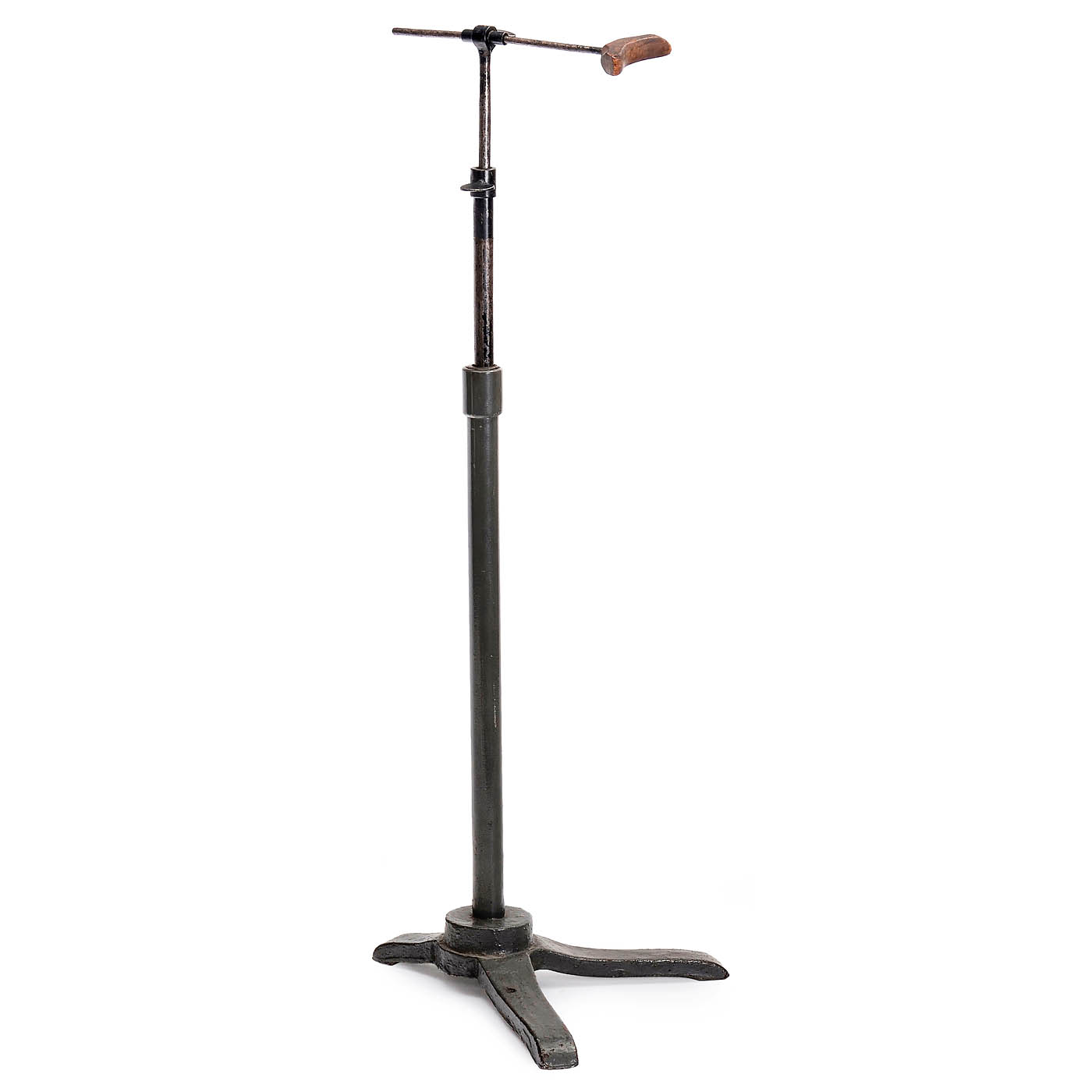 Cast-iron base, minimum extendable height of the two bars 80 cm, maximum height 180 cm, crossbar with wooden insert for the neck. An essential accessory for a photo studio from 1840 to 1930.