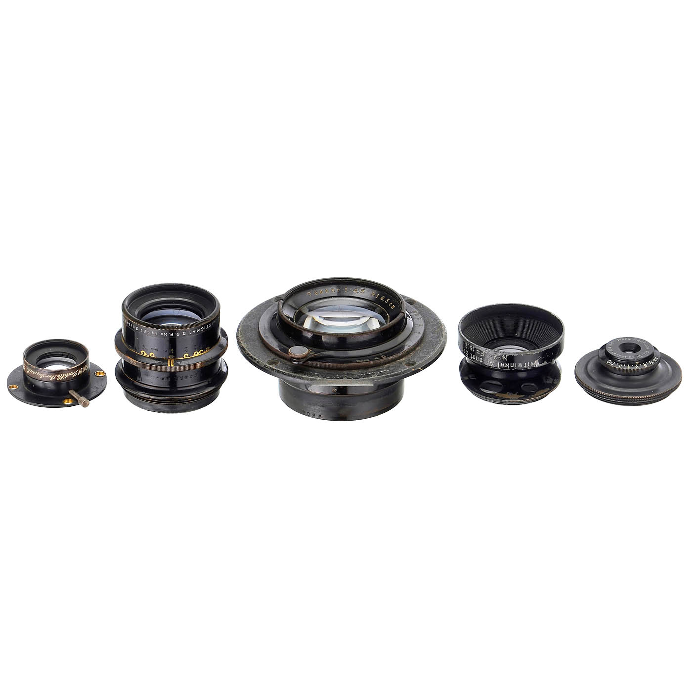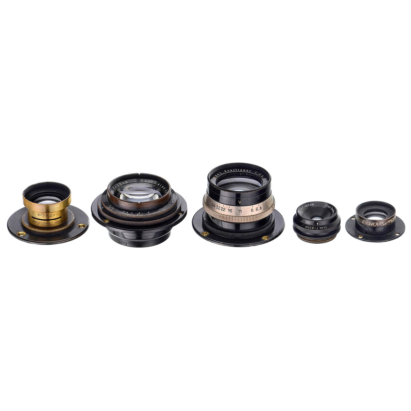 All lenses good under point light. 1) Carl Zeiss Jena. Anastigmat 12.5/196 mm, serial no. 4216, for Waterhouse stop, with screw-in ring. Rare and early wide-angle lens from the early days of Zeiss. (3/3) – 2–3) Krauss, Paris. Zeiss Anastigmat lens 12.5/183 mm, serial nos. 30021 and 30019, both with iris diaphragm and screw-in mount, well suited for a stereo camera. (3/3) – 4) Zeiss Jena Protar 18/8.5 cm, with iris diaphragm. (2-/2-) – 5) Zeiss Jena Planar 4.5/2 cm, with adapter, one of the first macro lenses. (3/3) – 6–7) Zeiss Jena Tessar 4.5/15 cm and 4.5/16.5 cm, both in a recessed mount with screw-in ring. (3-/3) – 7) Goerz, Berlin. Dagor 6.8/18 cm in standard mount. (3+/3+) – 8) Meyer, G?rlitz. Double Anastigmat 6.8/21 cm (Dagor type) in standard mount with screw-in ring. (3/3+) – And: 9) Busch, Rathenow. Wide-angle Aplanat Series C 15/150 mm with rotating diaphragm. (3-/3-)