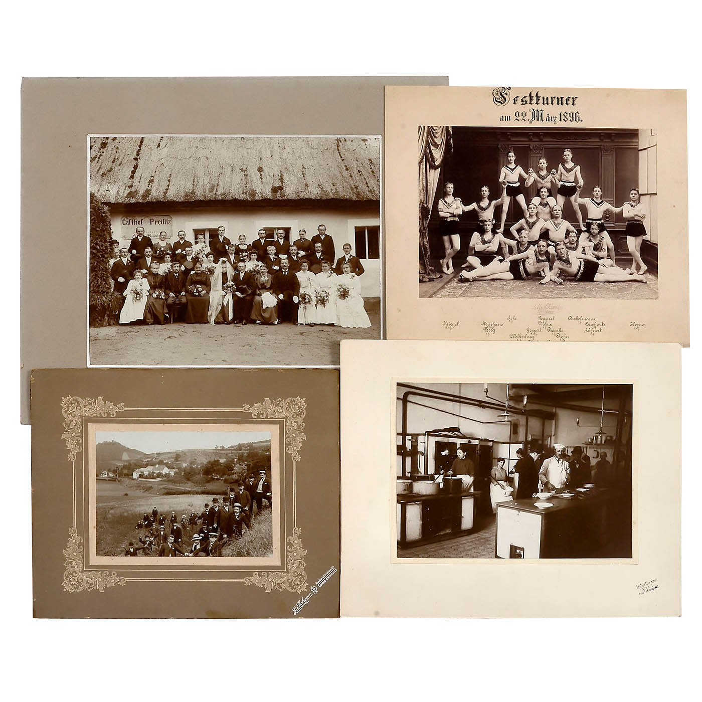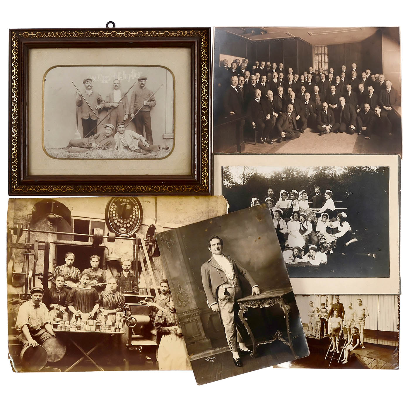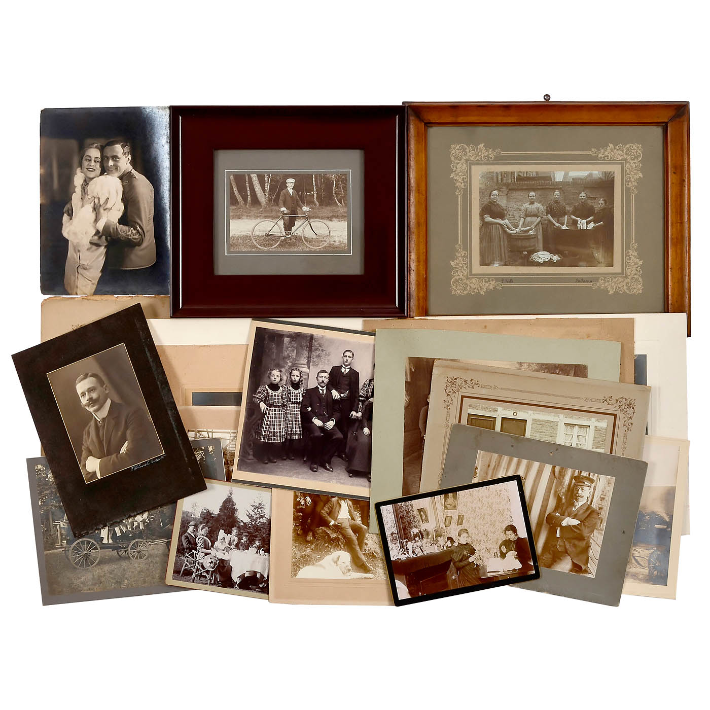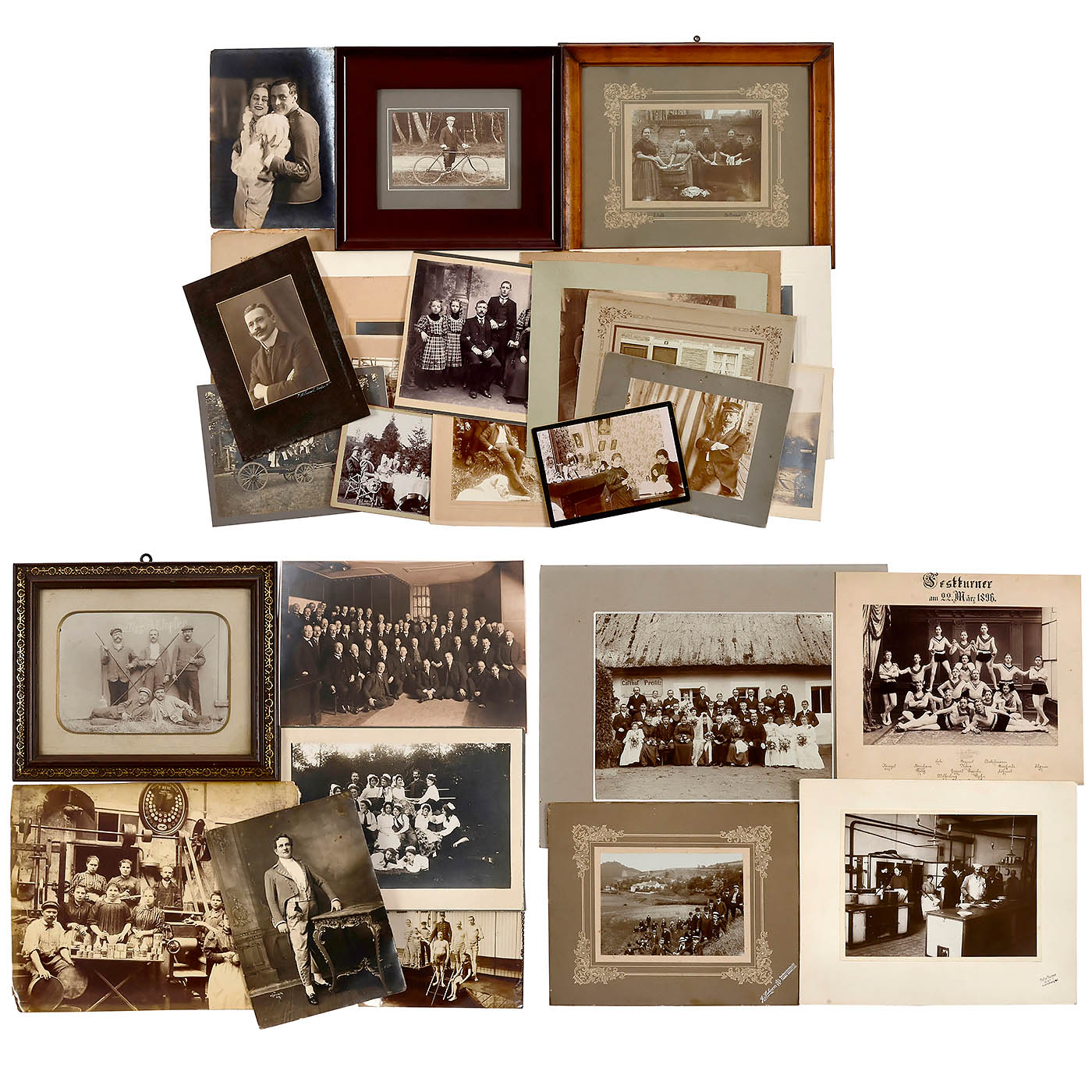 All of these photographs show a hint of the specific Rhineland way of life, which is characterized by not taking things too seriously (respectable men sit on the floor next to the apprentices) or of exaggeration, which August Sander developed even further. Unfortunately, none of these photographs are by him. There are 3 framed and 35 unframed photographs in formats from 13 x 18 to 23 x 28 cm, some mounted on cardboard. Pictures suitable for exhibitions, well-preserved.