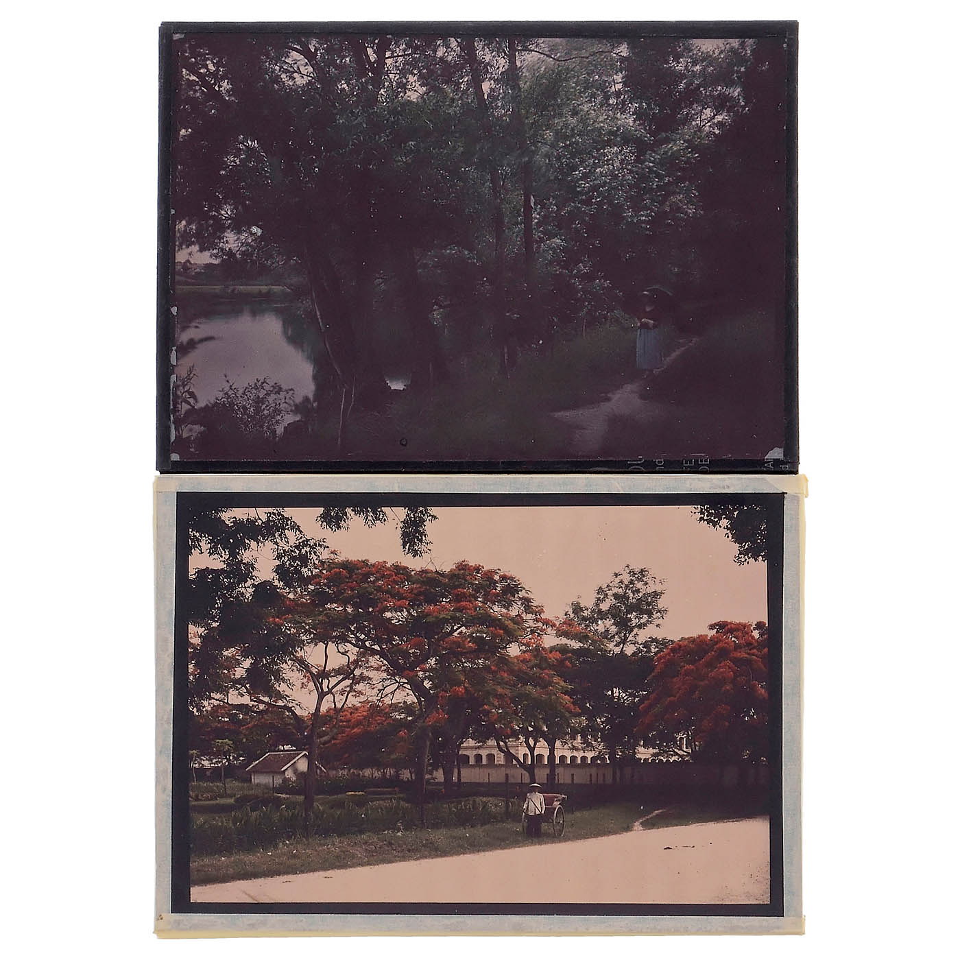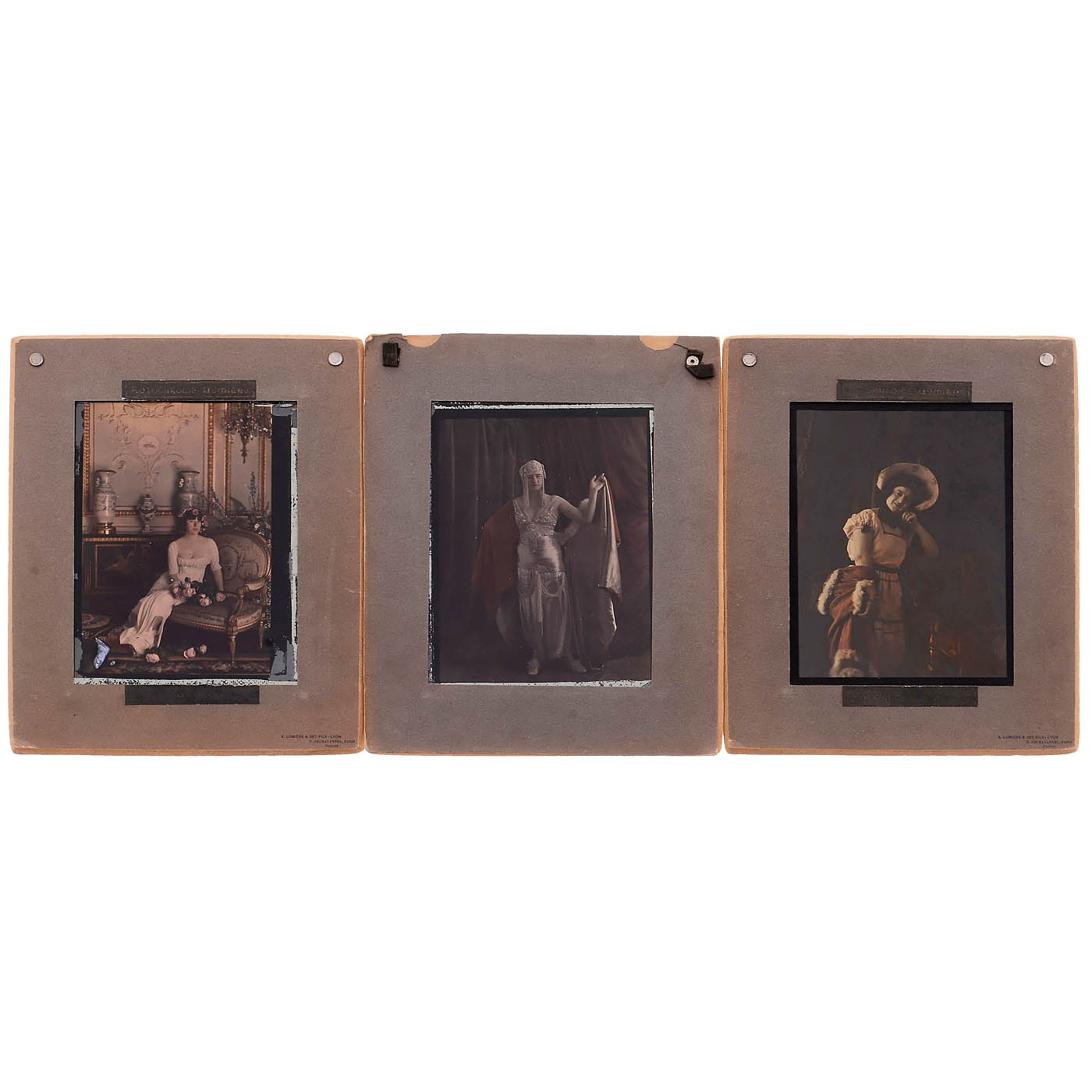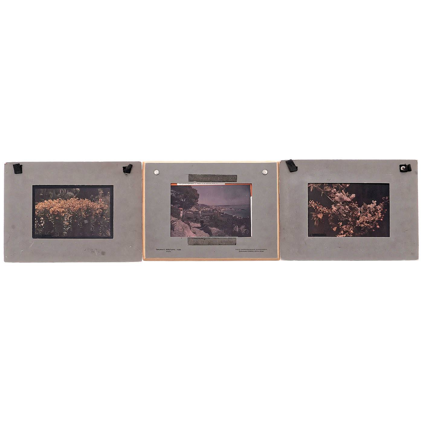 Lumière, Lyon. 1–6) 3 samples 26 x 33 cm, each with one 18 x 24 cm autochrome; and 3 samples 23 x 28 cm, each with one 13 x 18 cm autochrome. – 7–11) 5 autochromes 18 x 24 cm, including one depicting a Chinese building. – 12) One 30 x 18 cm autochrome. – And: 13–14) 2 Art-Nouveau-style glass frames, 23 x 28 cm and 34 x 26 cm, each containing a 13 x 18 cm autochrome. – Extremely rare; important exhibition pieces illustrating the history of color photography.