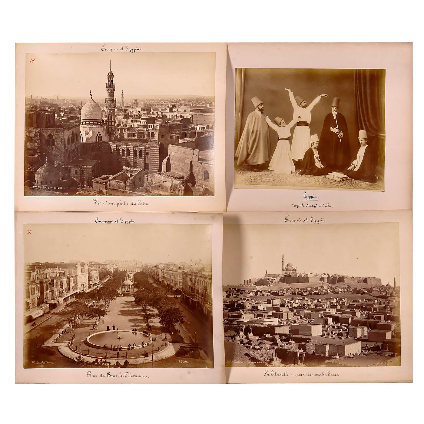 34 titled photographs of Egypt depicting its buildings, streets, squares, mosques, and inhabitants, all mounted on card stock ranging from 43 x 33 to 33 x 24 cm, in good condition. The set includes 6 photographs by Sebah, 3 by Bonfils, 4 by Zangaki, 1 by Beato, 1 by Lekegian, and 13 photographs without photographer attribution or with names that are difficult to read. Also included are 6 interesting ethnographic plates, each containing 4 images, including 11 images by Sebah.