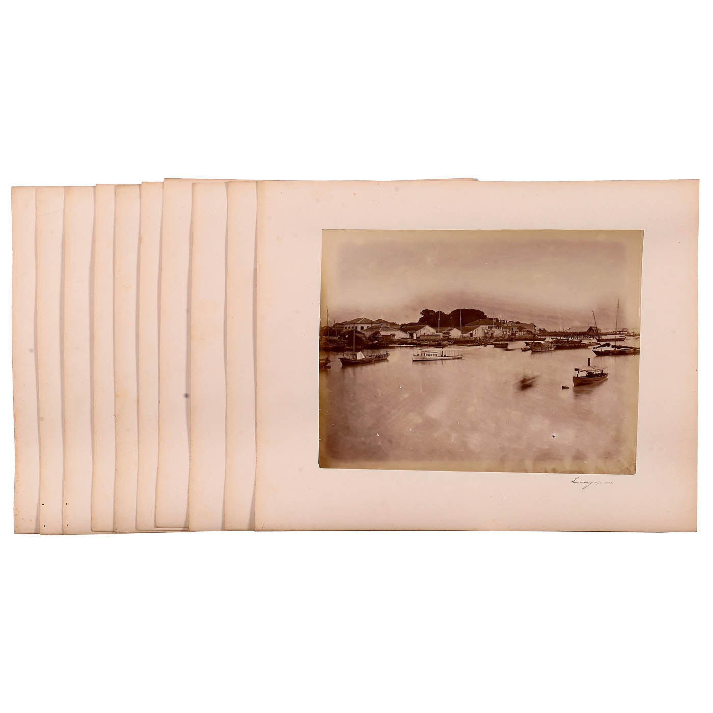 19 albumen photographs, 27 x 21 cm, depicting Asian port cities, streets, and inhabitants, all mounted on 31.5 x 39 cm card, in good condition. The set includes 7 photographs of Shanghai, 4 of Singapore, 2 of Hong Kong, 1 of Macau, 1 of the Sunda Archipelago, and 4 unlabeled views.