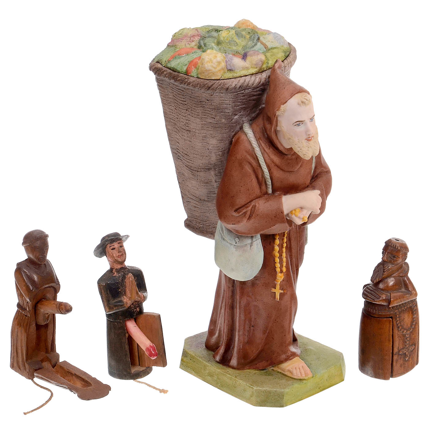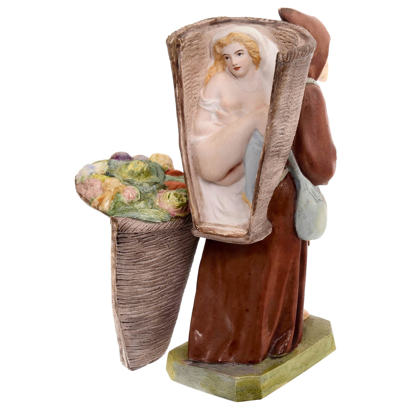 1) Pleasing porcelain figure c. 1900 of a youthful monk in a habit carrying a heavy load of fresh fruit and vegetables on his back. Removing the lid reveals a motif similar to Giovanni Boccaccio's Decameron. Height 26 cm. (2-/3) – 2) Extremely rare oak figure of a young monk, approx. 10 cm high. Pulling the cord reveals the fundamental problem of the clergy. Completely preserved. (3/3) – 3) Probably late medieval, wooden figure of an old monk with two flaps for the front and back. Contents missing. – 4) Naive folk art wood carving c. 1850 with a side-opening base. Completely preserved. (3-/3) – And: 5–6) Two artist's anatomy models, 25 cm and 36 cm high, suitable for this theme, as their missing body parts indicate misuse. (4/–) – Interesting exhibition material. – Provenance: From the Ronny van de Velde Collection.