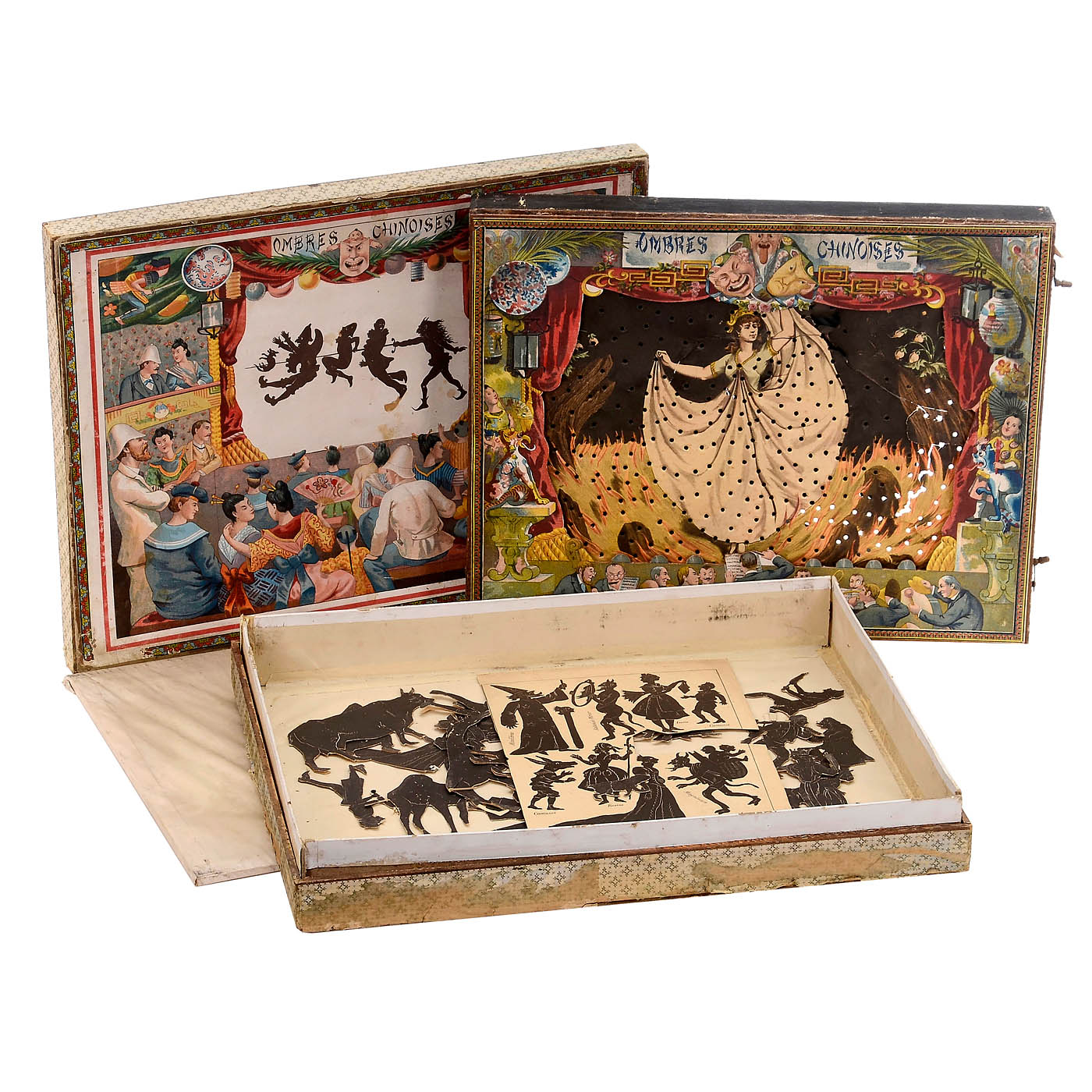 M.-D., Publisher, Paris. All for 44 cm wide background slides and with a crank-operated effect roller with stripes. 1) "Ombres Chinoises à Grand Effet," instructions and contents listed on the lid, a portable theater with a musical mechanism (mounting screws replaced), running, 6 slides: La Loie Füller ou la Danse serpentine; Une Fête villageoise; L’Embrasement du Trocadero à Paris; Les Fontaines lumineuses; Bataille de Confetti Place d’Opera; (different motif than text on the lid:) Exposition Générale des Jouets aux Magales du Bon Marché. All in good condition. Includes a blank canvas and various movable figures. Box 39.7 x 50.3 x 12 cm with gold-colored exterior decoration. A very complete theater set! (3/3) – 2) "Ombre Chinoises A Grand Effet", stand-up theater, effect roll and Snake Dance insert with tears, with blank canvas and various figures. Box 38 x 49 x 7 cm with different decoration than before. (4+/4) – And: 3) Ombre Chinoises, version without instructions, stand-up theater, Snake Dance insert trimmed at the corners, with blank canvas, uncut partial sheet and various figures. Box 49 x 38 x 7 cm with red exterior decoration. (3-/3)
