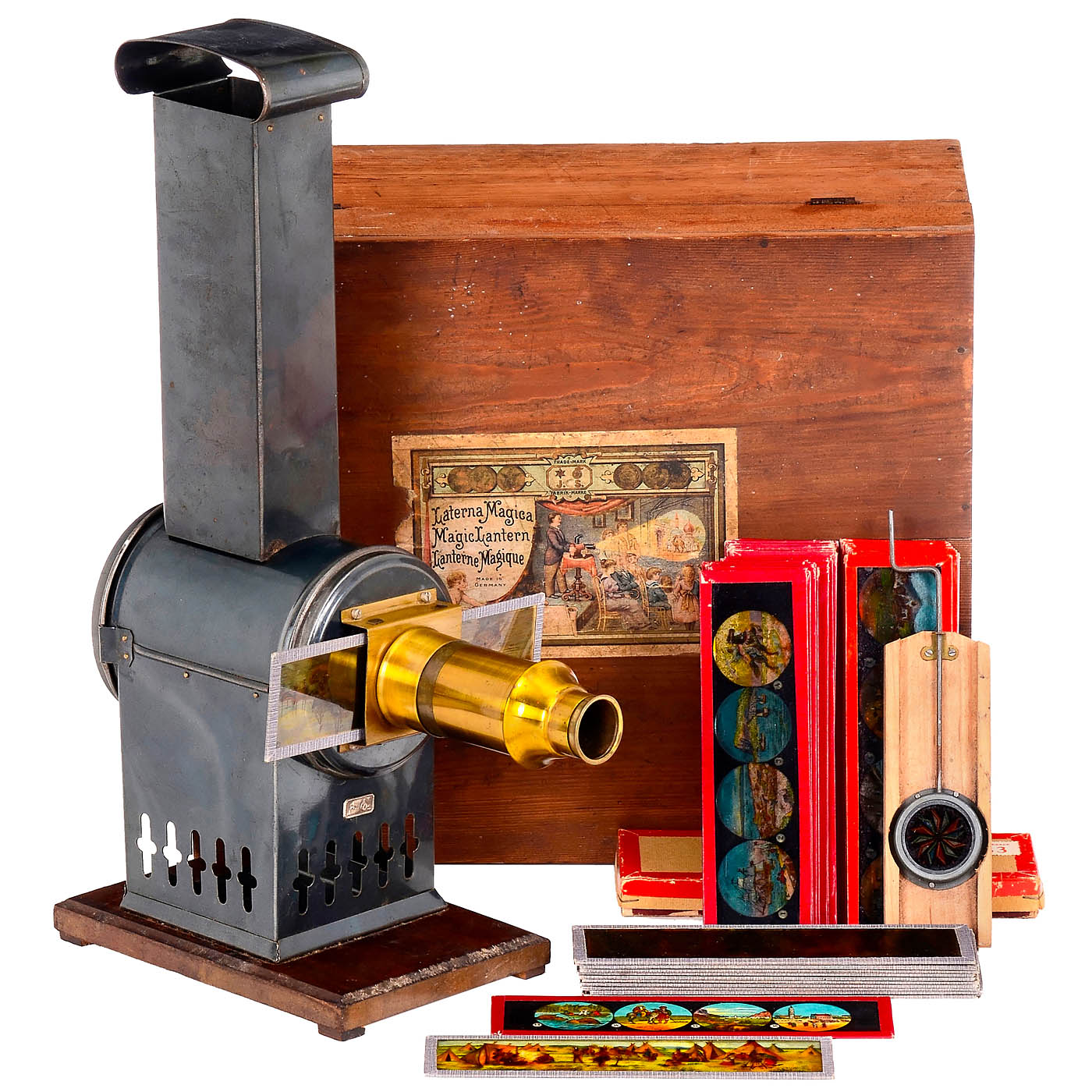 Jean Schoenner, Nuremberg. Blue sheet steel, a slightly different version than the type "362/1-4, Fine Magic Lantern" described in Hrabalek, p. 113. Designed for 5 cm wide strips, 43 cm high including chimney. The inner reflector is clean. Includes the original box, thaumotrope, two complete series (1–12 strips) depicting a journey around the world by two manufacturers, a complete series of 12 strips from the German Empire, 10 comic strips by Wilhelm Busch, and 11 strips from the North America series (the last strip, 45–48, is missing). The lantern and strips are in very good condition – ideal for a modern magic lantern evening to show media-saturated children the good old days.