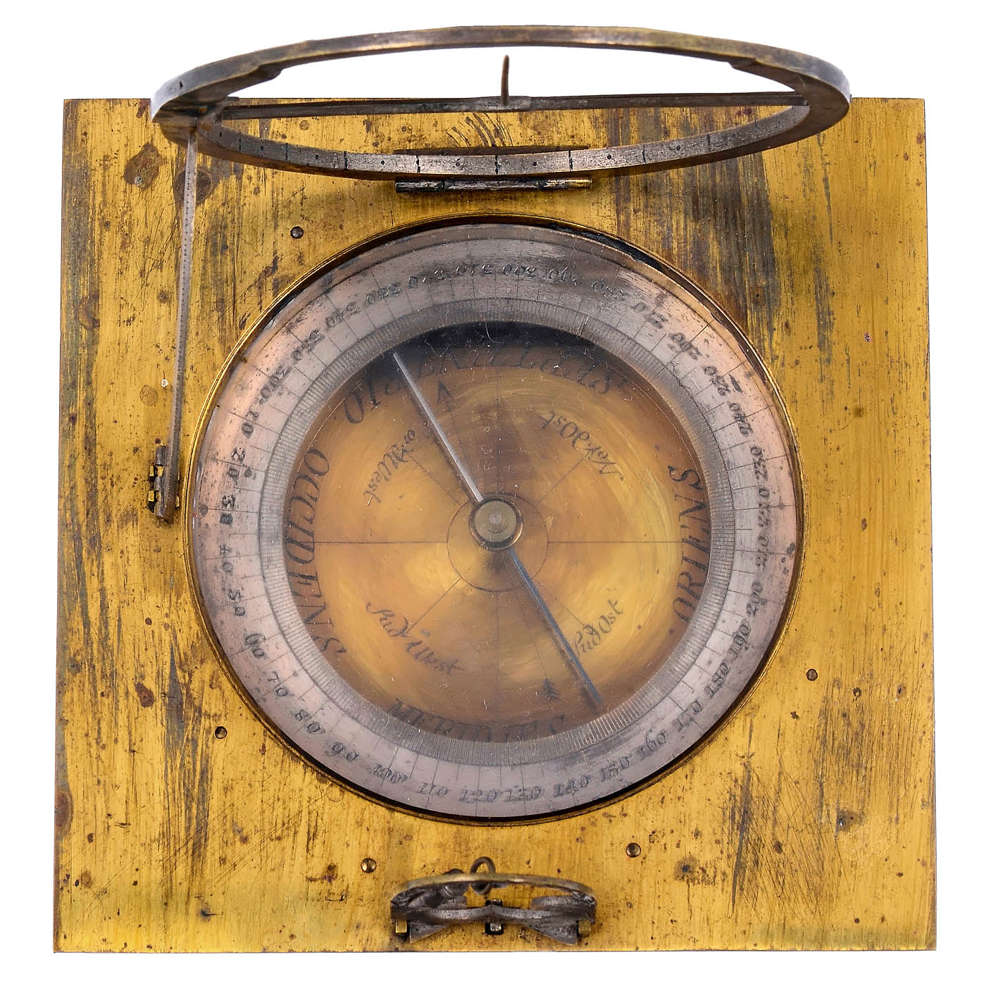 Presumably Augsburg, Germany, original lacquered brass, compass with brass rosette and silver-plated scale, ? 3 1/6 in., external dimensions 4 ? x 4 ? in.; folding hour ring and latitude scale, folding plumb bob, original rod gnomon. – Johann Friedrich Brander (1713–1783) built very similar sundials. The condition of this sundial is good to very good (not patinated and not polished).