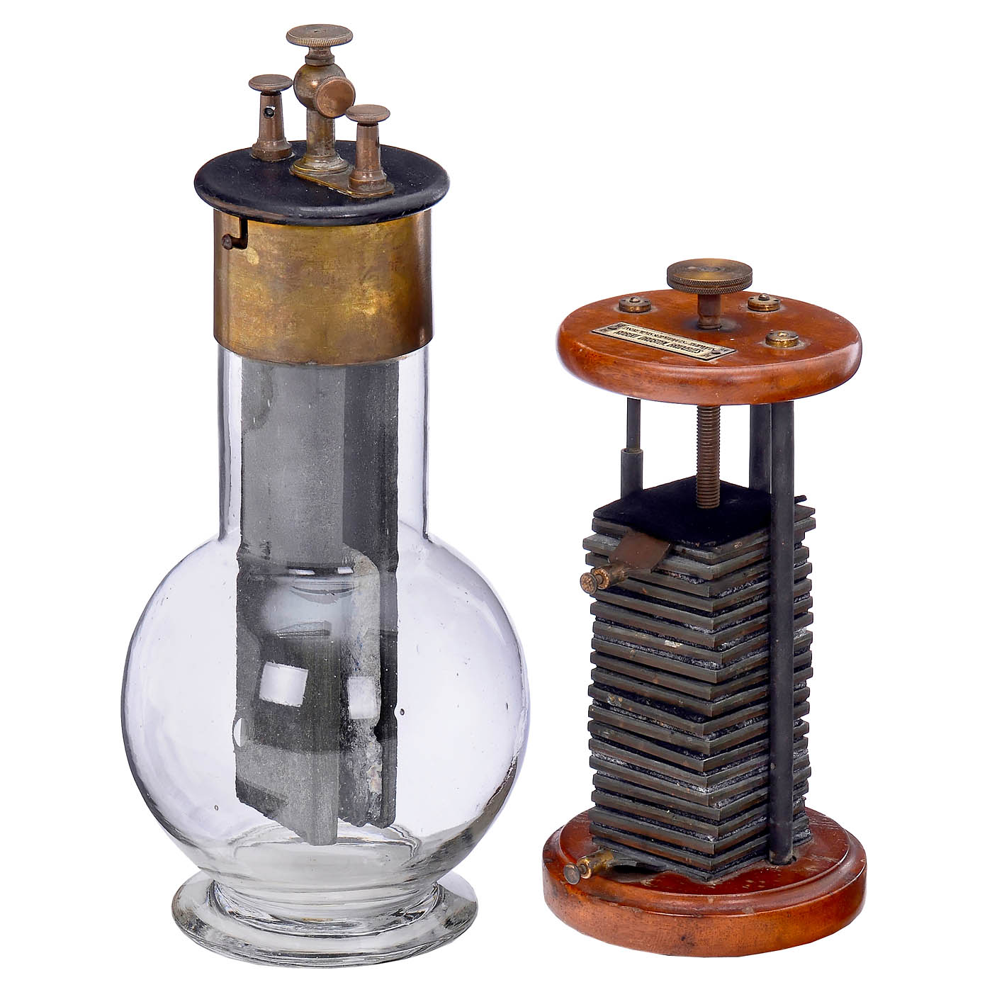 1) Voltaic pile according to Alessandro Volta, c. 1900, demonstration model by Robert Drosten in Brussels, consisting of 20 Voltaic cells and 2 electrodes, height 9 in. – And: 2) Chromic acid bottle cell according to Grenet, c. 1870, glass flask with 2 carbon and 1 zinc plates, height 12 ? in.