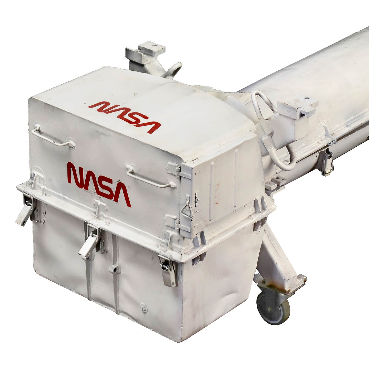 Fiberglass and steel, high-gloss silver metallic paint, length 125 in (316 cm), ? 26 in., 4 rotating tailfins and 4 fixed nosefins. In heavy-duty NASA steel transport case, length 129 in. (325 cm). – An aero-dynamic wind tunnel test model, used in the Central Institute of Aviation Motors (CIAM)in Moscow. Constructed in a joint effort between the American National Aeronautic and Space Administration (NASA) and the Russian Central Institute of Aviation Motors (CIAM) in Moscow. – An amazing and rare artefact for space flight history collections!