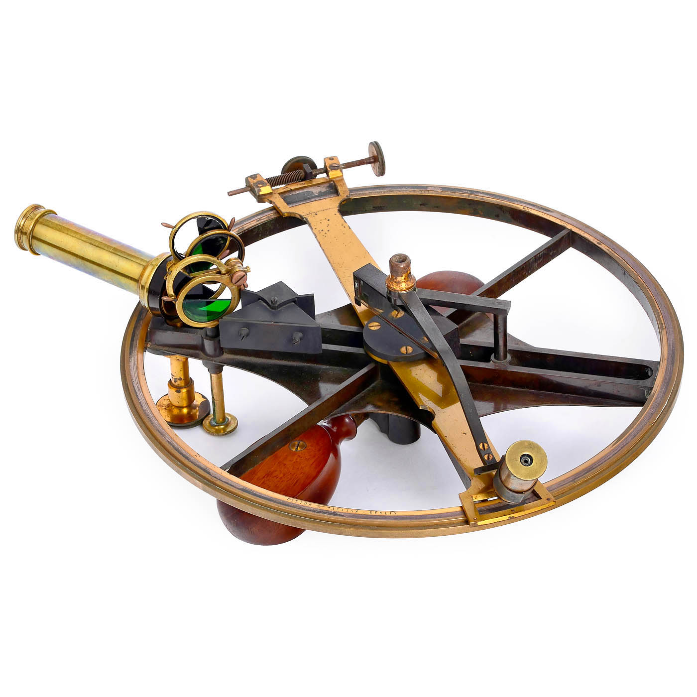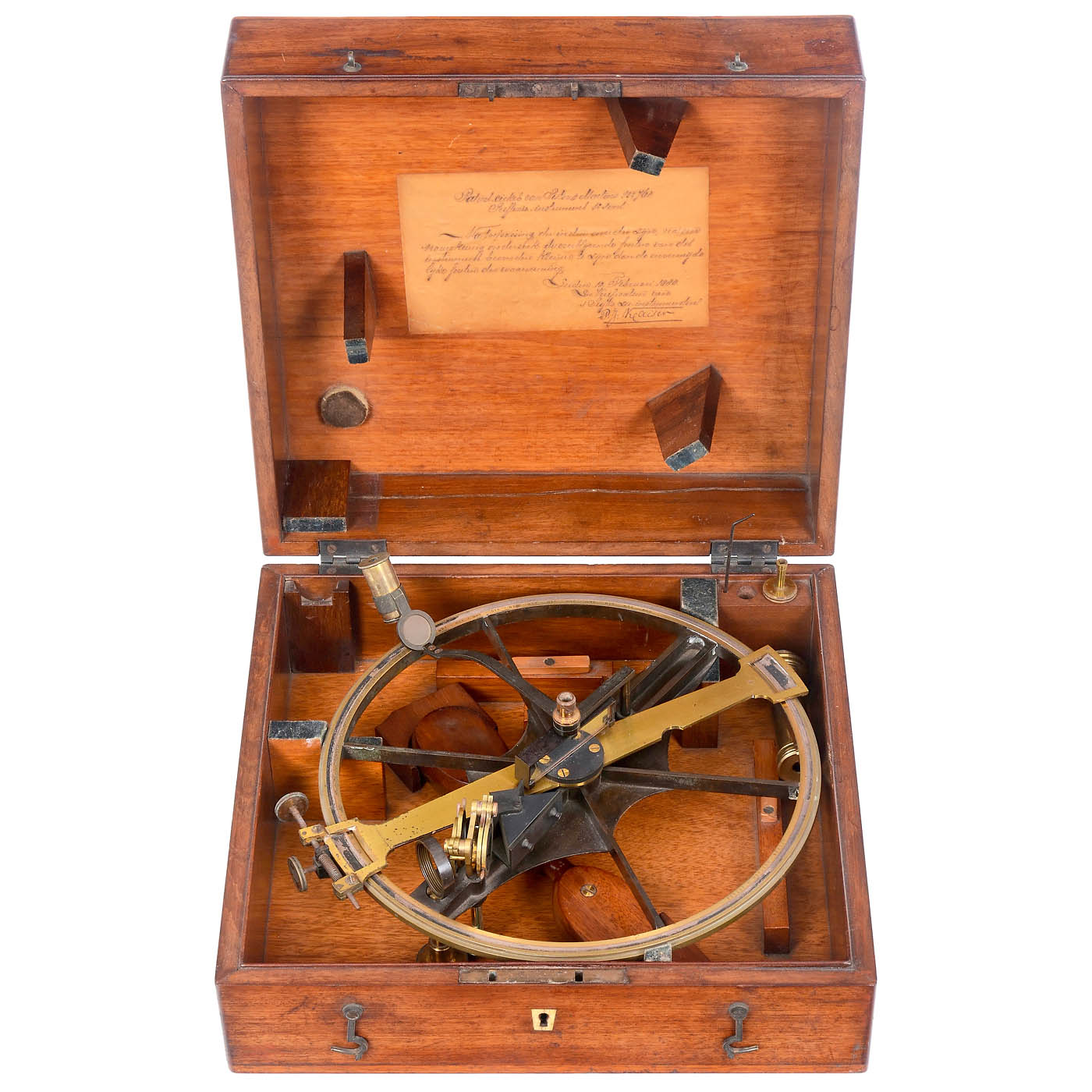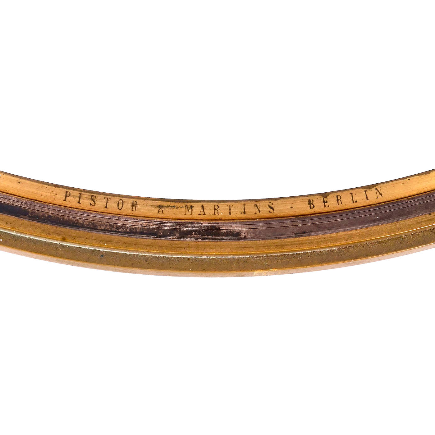 Mirror circle, signature on the outer ring "Pistor & Martins Berlin", opposite this signature the number "761", original lacquered brass, the inner frame is burnished (all original), mahogany handle, diameter 10?1/5 in.; silver scales, with prism and 4 fold-out half filters, a telescope, a focusable reading magnifier, optically and mechanically in good condition (perfectly functional), original mahogany case with inscription from 1880 (by the owner) in the lid. – Instead of the 60-degree scale of the sextant, the full-circle sextant has a full circle and is used to determine the angular distances of astronomical objects. This improvement was introduced by the mathematician and astronomer Tobias Mayer in 1755. – One of the rare examples of this mirror instrument is located in the Astronomical-Physical Cabinet in the Orangery in Kassel.