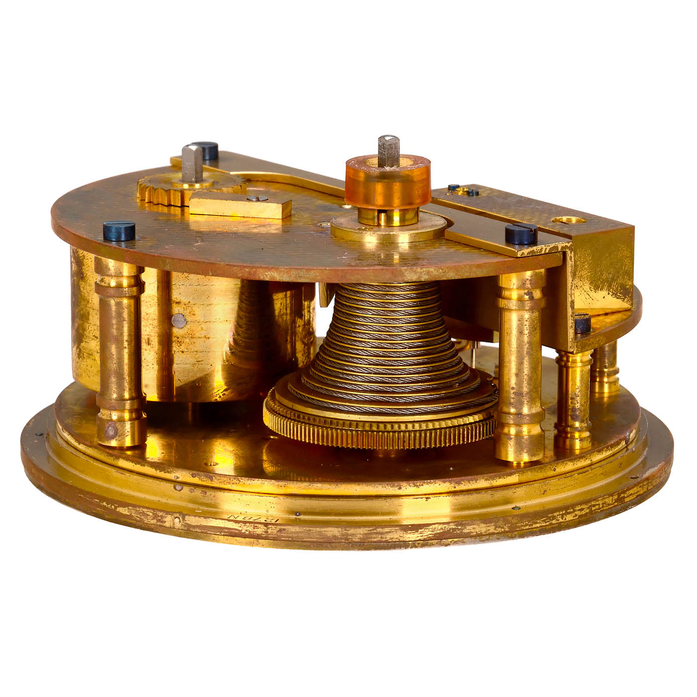 Signed "Thomas Mercer Ltd, St Albans, England", no. 1278N, with gilt full-plate brass single-string fusee movement, silvered dial, outer minute ring, Arabic numerals, subsidiary seconds, 8-day winding indicator, blued hands, gimbal-mounted in glazed mahogany deck box, with key, defective, the balance bearing needs to be repaired.
