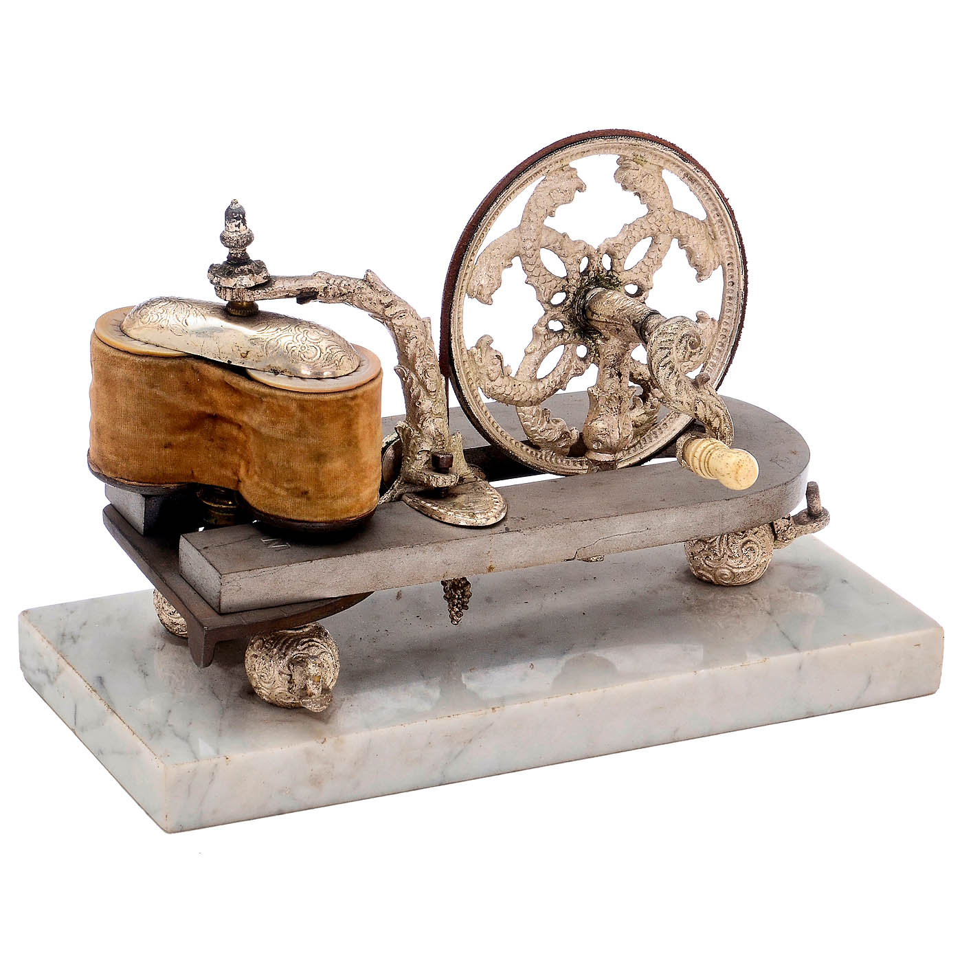London, marble base, horseshoe magnet, two rotating coils, silver-plated and decorated metal parts, hand-cranked mechanism, size 10 x 4 ? in.