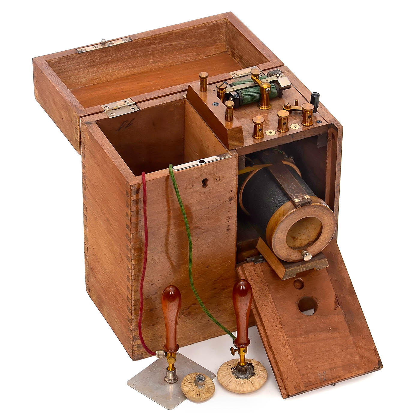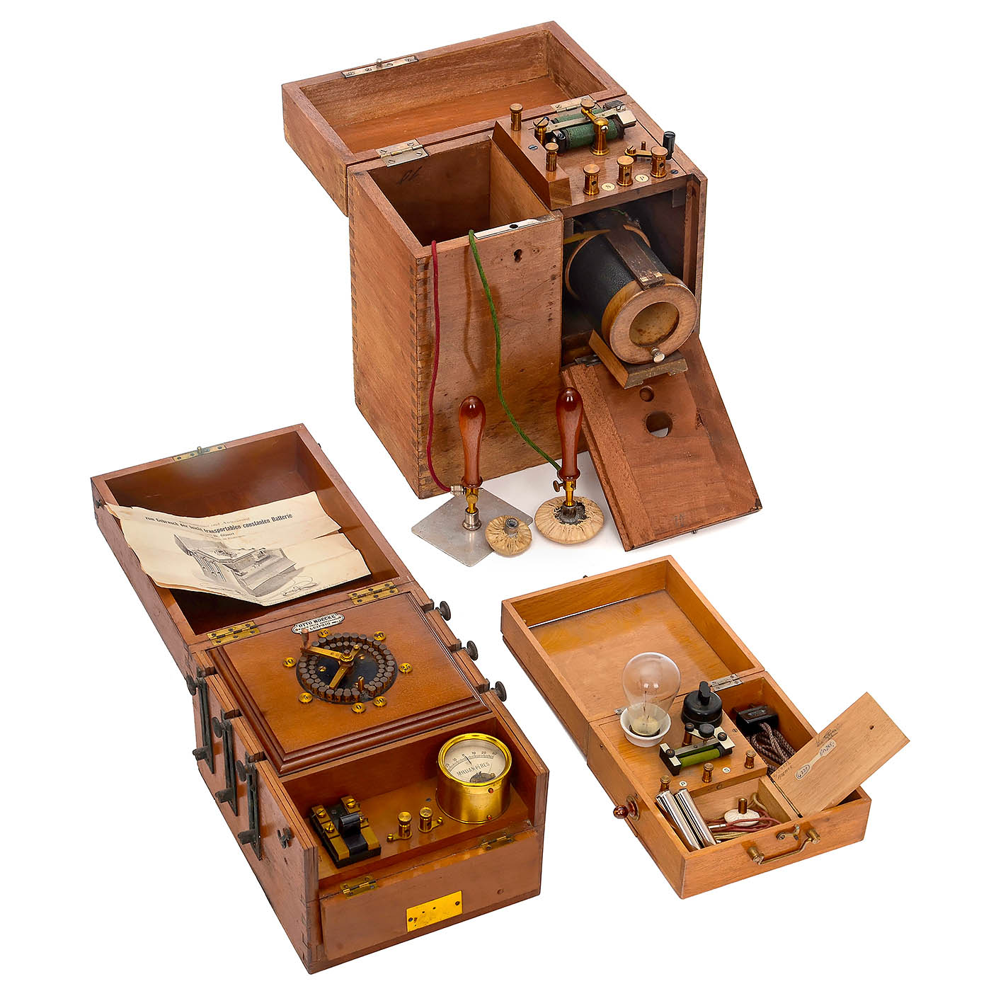 Used for electrotherapy. 1) Battery, Otto Moecke in Leipzig, with immersion elements, crank switch and milliammeter, in mahogany case, with original instructions. – 2) Unmarked, for connection to a power supply, light bulb as series resistor, with 2 electrodes. – And: 3) Induction apparatus, Otto Walther in Dresden, with induction coil and 2 electrodes, in walnut case.