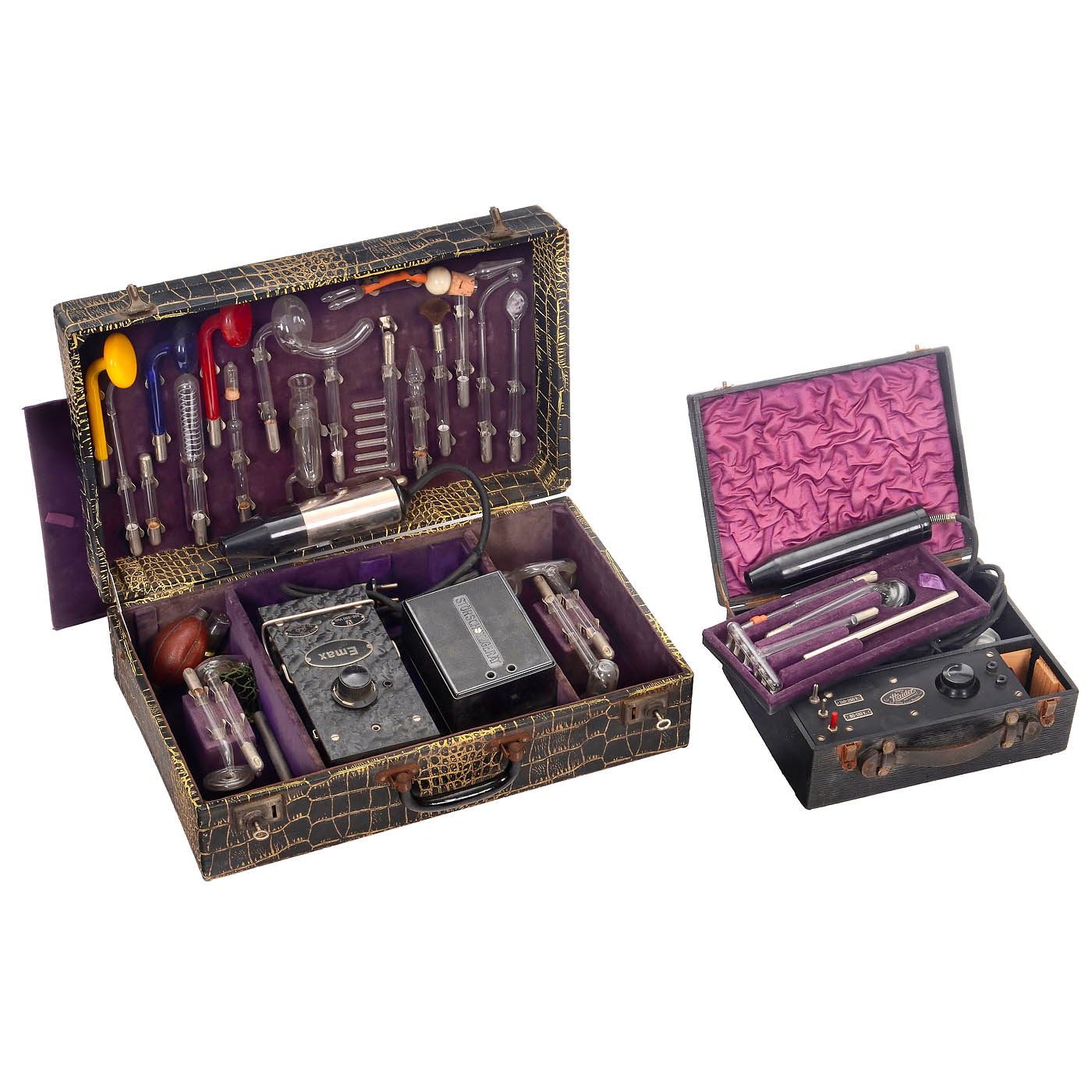 1) "Emax", one transformer and one Tesla coil for generating high-frequency voltage, 20 different gas-filled glass electrodes. – 2) "Helio-Lux", one transformer and one Tesla coil, 15 different gas-filled glass electrodes. – 3) "Frequenta", one transformer and one Tesla coil, 6 different gas-filled glass electrodes. – 4) "Heider", one transformer and one Tesla coil, 4 different gas-filled glass electrodes. – And: 5) "Branston", one transformer and one Tesla coil, 1 gas-filled glass electrode. – Devices of this type were used in quackery, but also in sedative therapy. Untested. – Good condition.