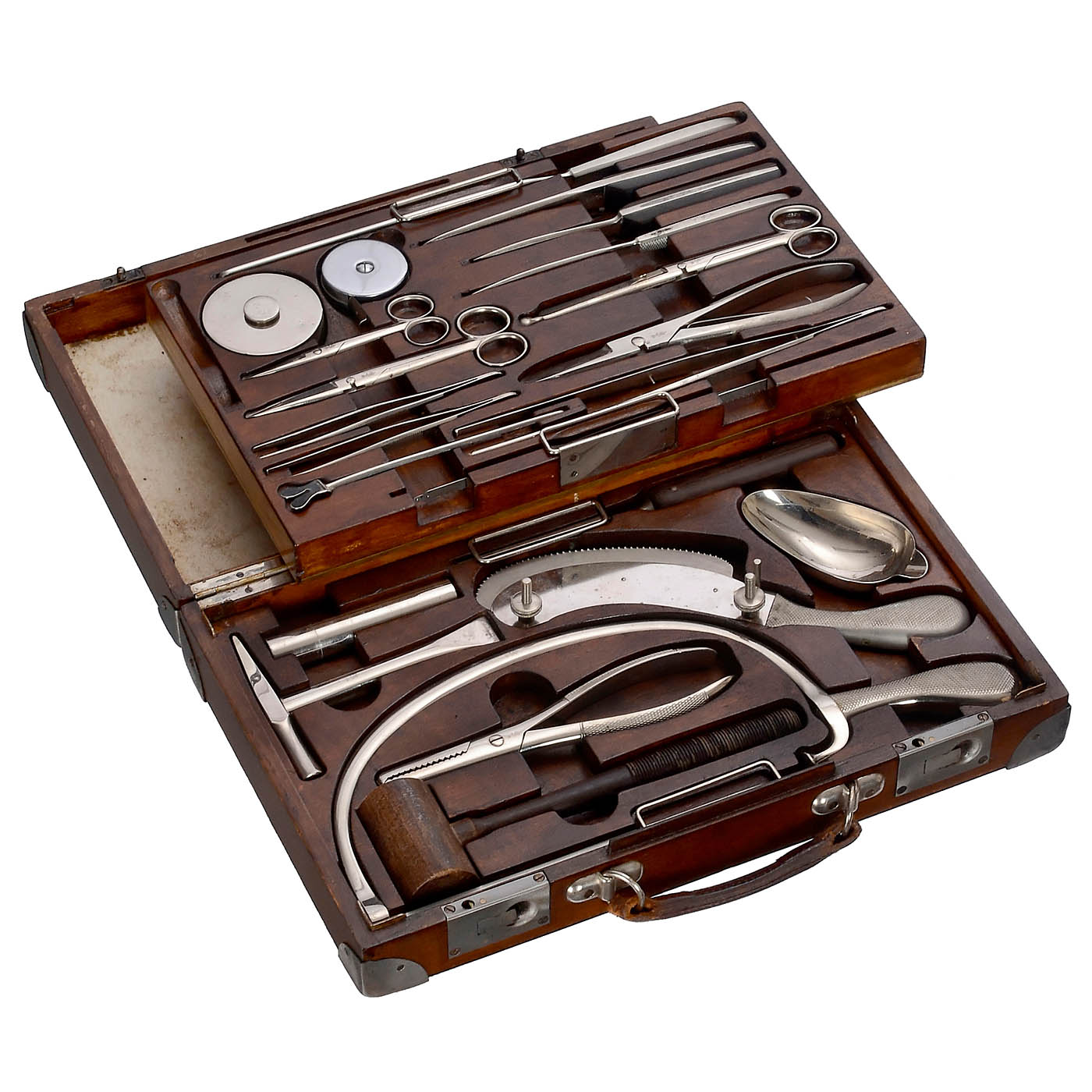 Germany, most instruments signed with crown, Aesculapian staff and snake, with 2 bone saws, tweezers, knives, pliers, tape measure, bowl, mahogany hammer and other parts in case (one part missing), dimensions 17 x 10 ? in.