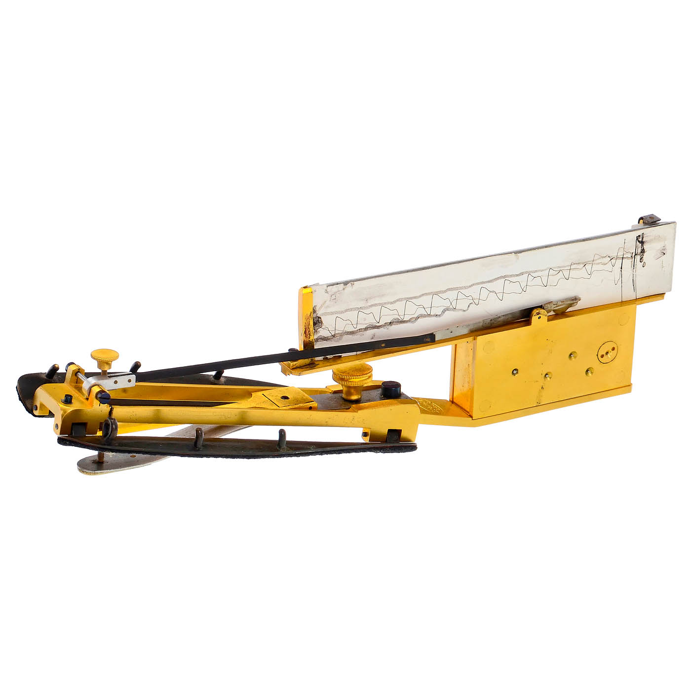 1) Breguet brass Dr. Marey's sphygmograph, late 19th century, French, with clockwork movement recording the pulse via a bone sensor, in velvet-lined fitted leather-covered case, length 8 ? in. – And: 2) Dudgeon-type sphygmograph/pulseometer, c. 1890–1910s, Hawsley & Sons, London, small clockwork mechanism, for paper strip. The pulse causes a needle to oscillate and mark the paper for each pulse beat, with fabric strap in velvet-lined and leather-covered case.