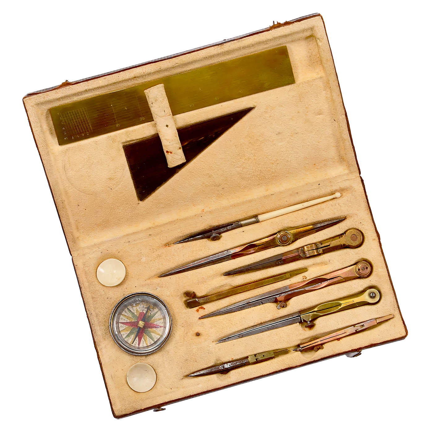 Unmarked. Edge system with recessed grip, leather-lined wood case, at the rim embossed leather-covered outer casing, 9 in. wide, fitted with brass and steel instruments (including a golden ratio compass): Compass, double-ended and single dividers and drawing pens, ebony triangle, a small compass with paper rose and blued steel needle and 2 bone inkwells.