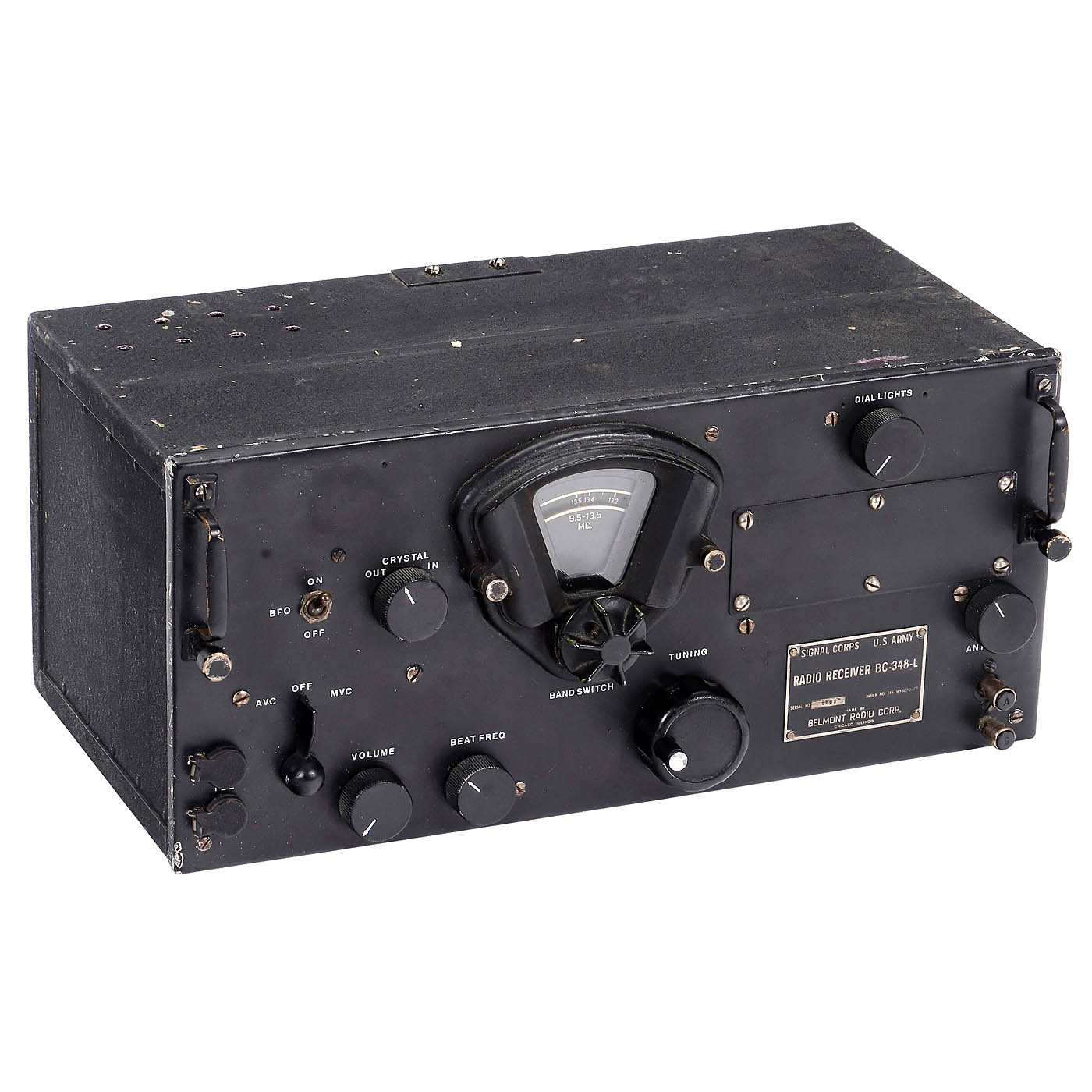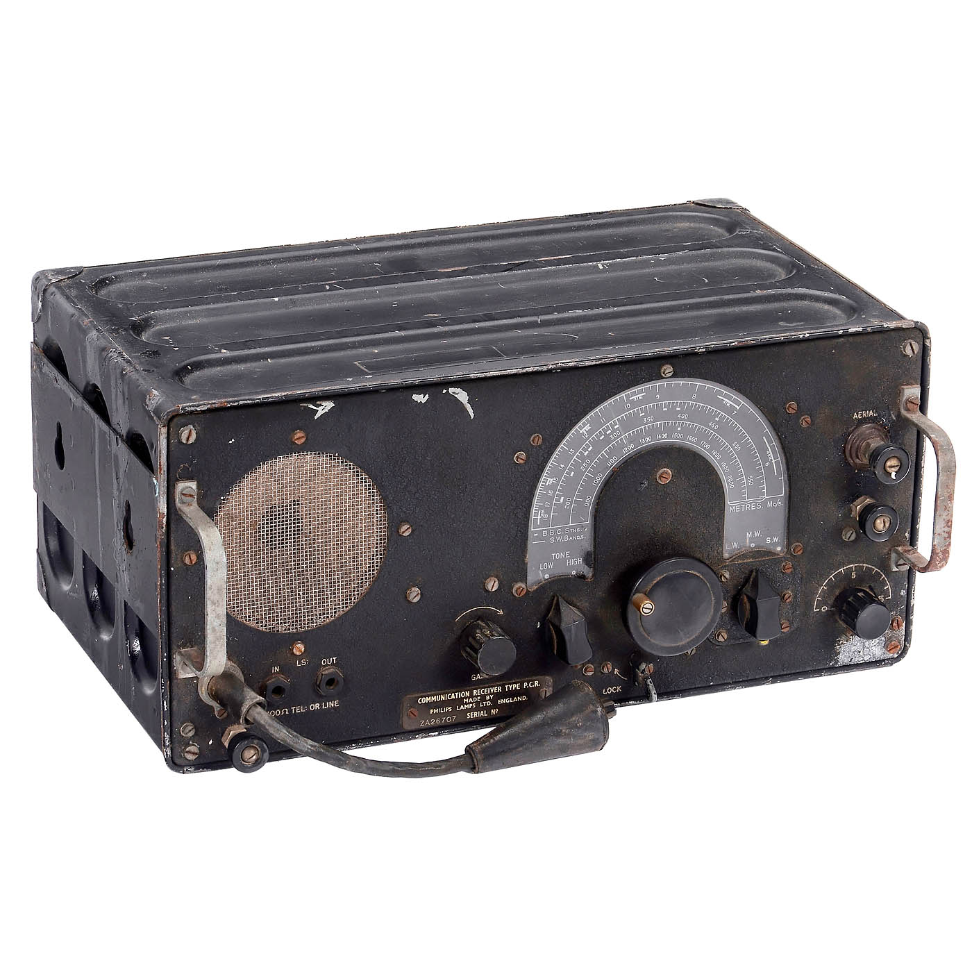 1) Model BC-348-L, Belmont Radio Corporation, for the US Army Signal Corps, 8 tubes, battery-operated. – And: 2) Communication receiver P.C.R., designed by Pye and built under contract by Philips, 6 tubes, 3 wave ranges, internal speaker, for mobile or airborne purposes, for external power supply.
