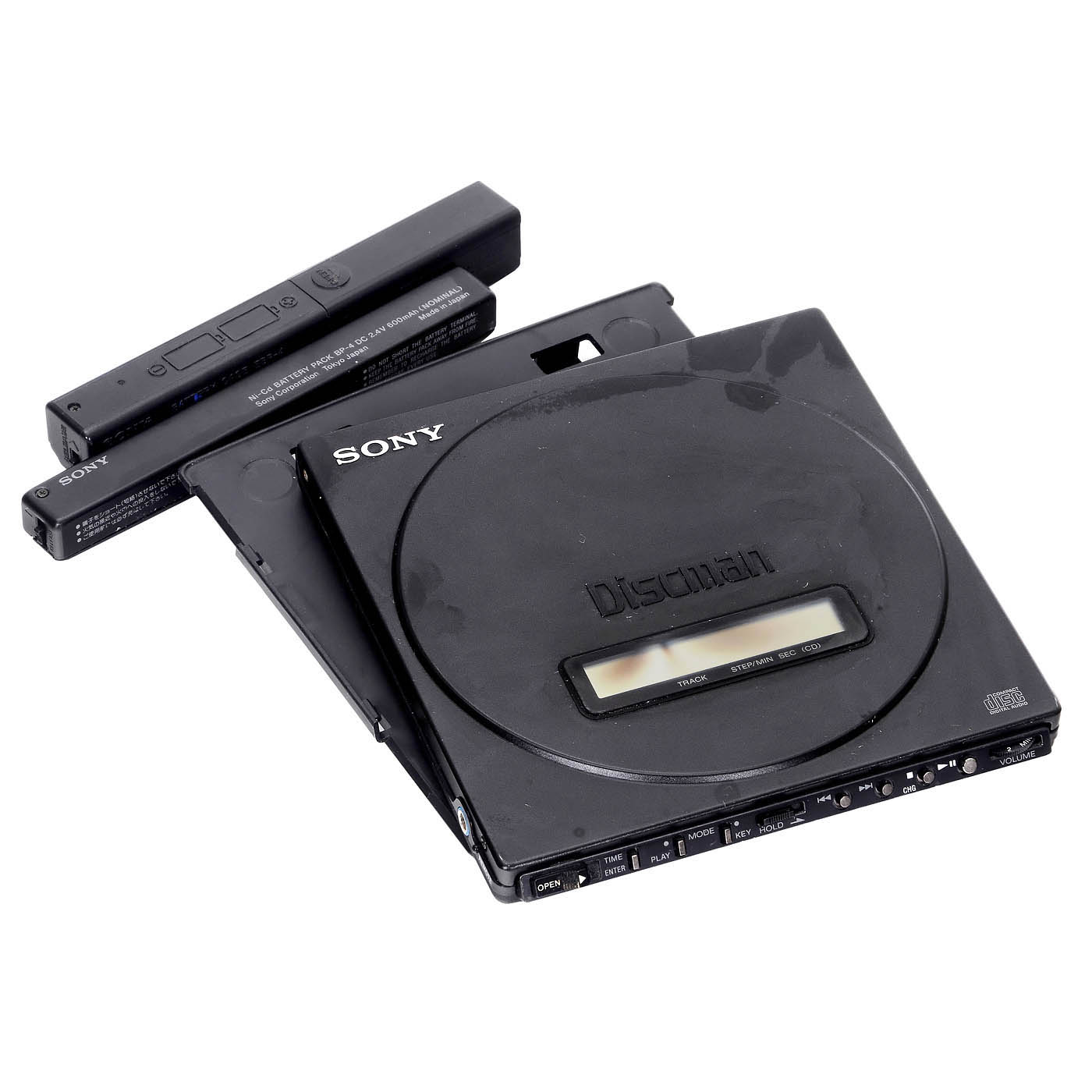Japan, ultra-slim CD player, with newly developed optical pickup laser coupler, a thin brushless motor, highly integrated circuits and other Sony innovations, with Ni-Cd battery pack (unfortunately defective), case for two 1.5-volt batteries, protective cover, car holder, circuit diagram and operating instructions. – The D-J50 came onto the market in 1991 as the flagship of the Discman, with first-class sound quality, working.
