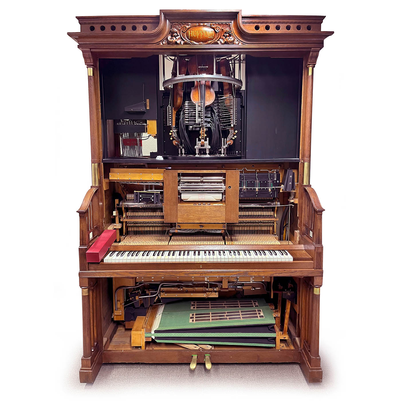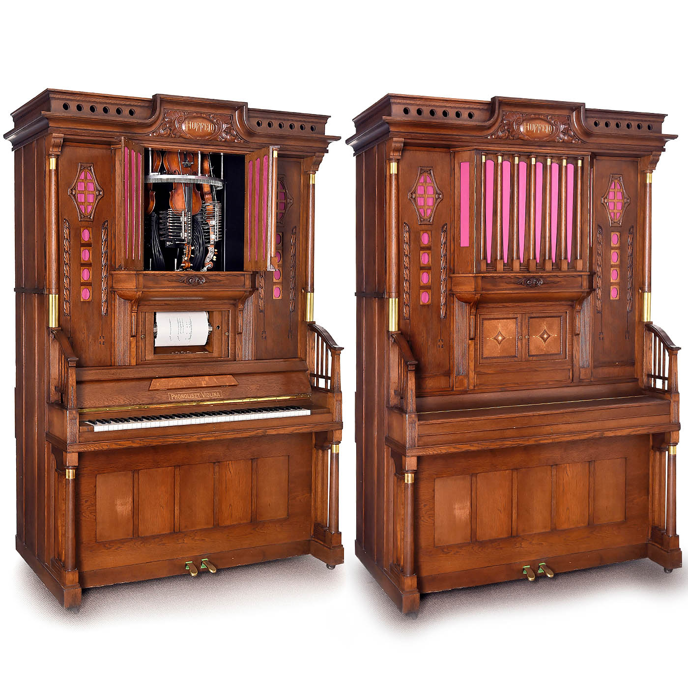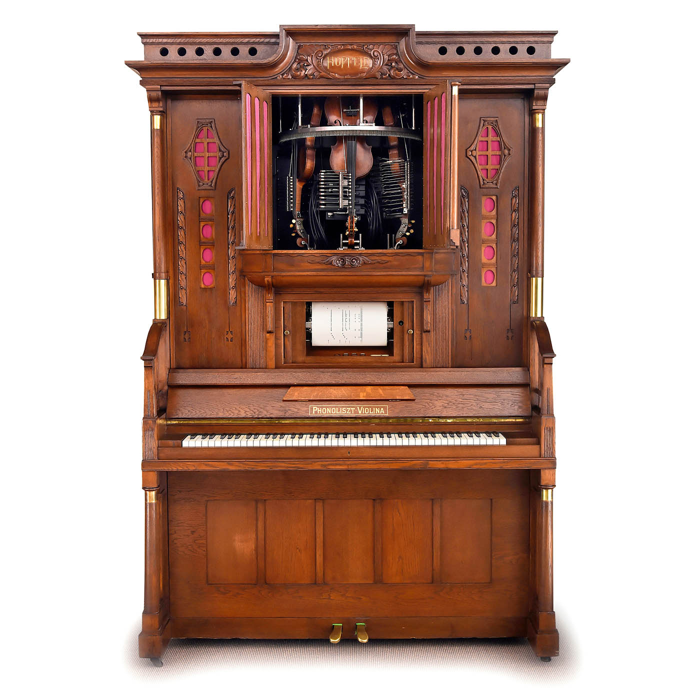 Ludwig Hupfeld A.G., Leipzig. Coin-activated pneumatic orchestrion with piano and three violins, driven by a 230-volt electric motor, in oak case with cloth-backed fretwork panels, rounded doors and carved integral pediment flanked by brass-capped columns, 166 x 119 x 225 cm, playing condition, the violins in need of tuning, more air pressure is requested, with 93 old and re-cut music rolls. – Note: A single string (D, A and E) is played on each of the violins, while the other strings resonate. The traditional violin bow is replaced by an octagonal wheel laced with horsehair. The sensitivity and finesse of the rendition are achieved by the speed of the bow, the pressure of the violins on the bow and the artificial fingers. Thus, a number of different types of stroke, including legato, staccato and vibrato, can be represented expressively in mechanical form. To accompany this, 44 piano notes are played with nuance.