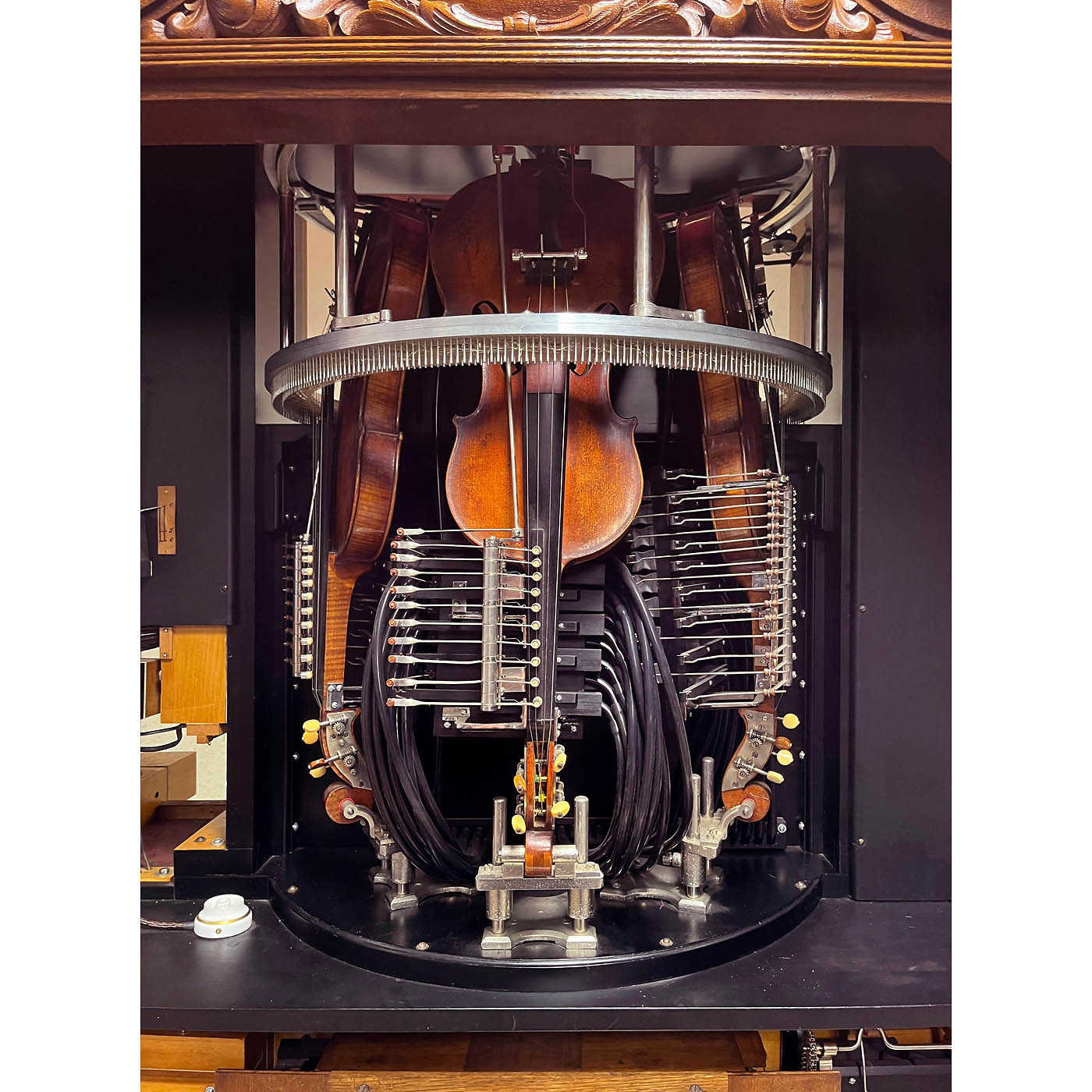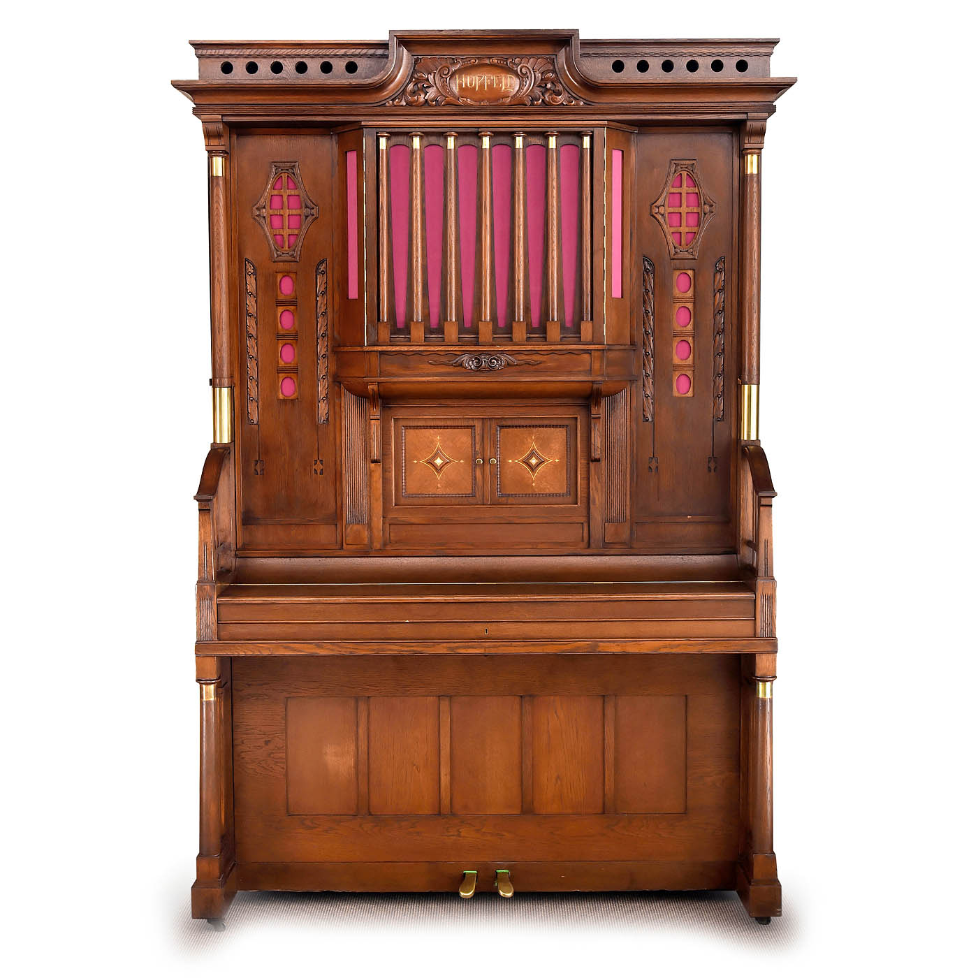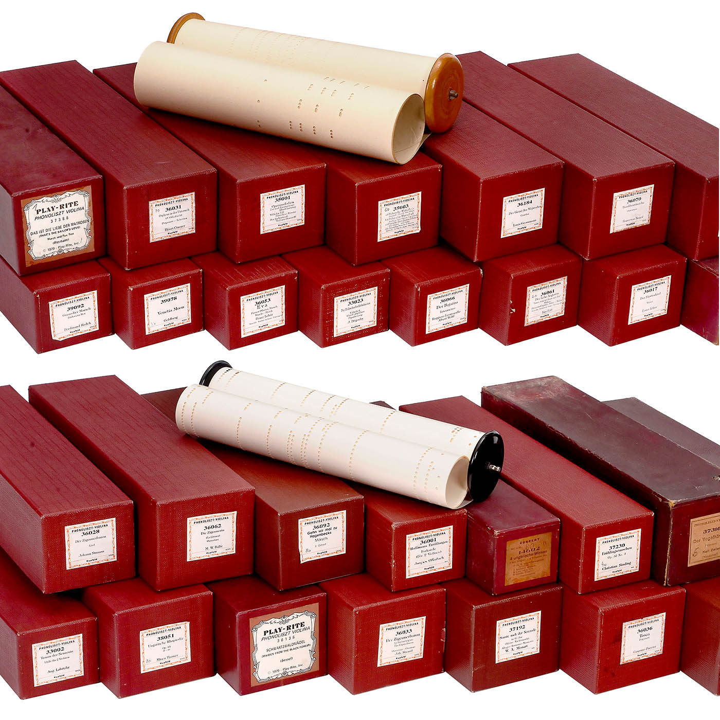 Ludwig Hupfeld A.G., Leipzig. Coin-activated pneumatic orchestrion with piano and three violins, driven by a 230-volt electric motor, in oak case with cloth-backed fretwork panels, rounded doors and carved integral pediment flanked by brass-capped columns, 166 x 119 x 225 cm, playing condition, the violins in need of tuning, more air pressure is requested, with 93 old and re-cut music rolls. – Note: A single string (D, A and E) is played on each of the violins, while the other strings resonate. The traditional violin bow is replaced by an octagonal wheel laced with horsehair. The sensitivity and finesse of the rendition are achieved by the speed of the bow, the pressure of the violins on the bow and the artificial fingers. Thus, a number of different types of stroke, including legato, staccato and vibrato, can be represented expressively in mechanical form. To accompany this, 44 piano notes are played with nuance.