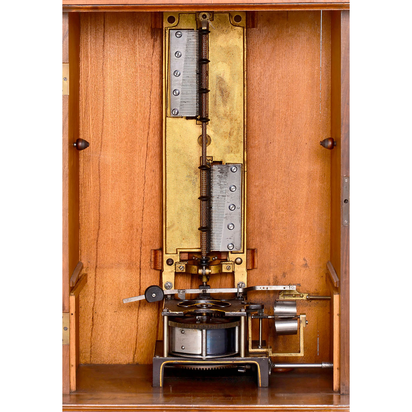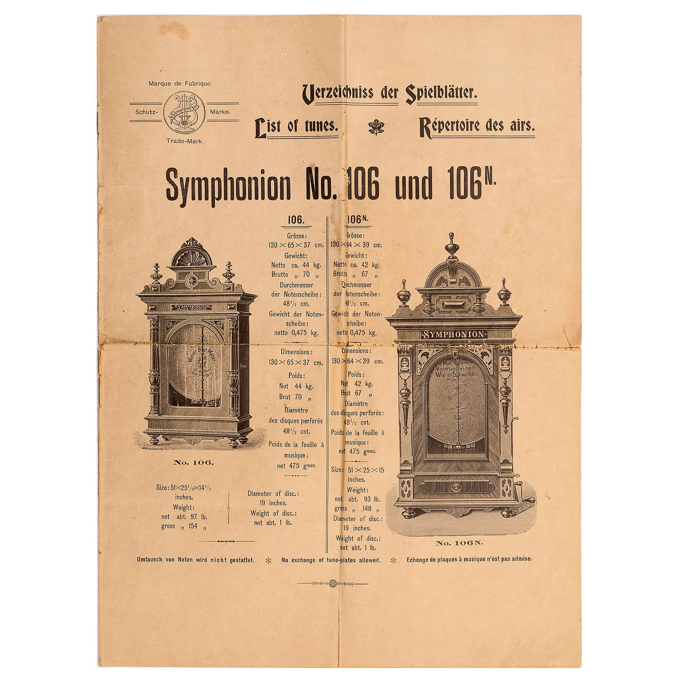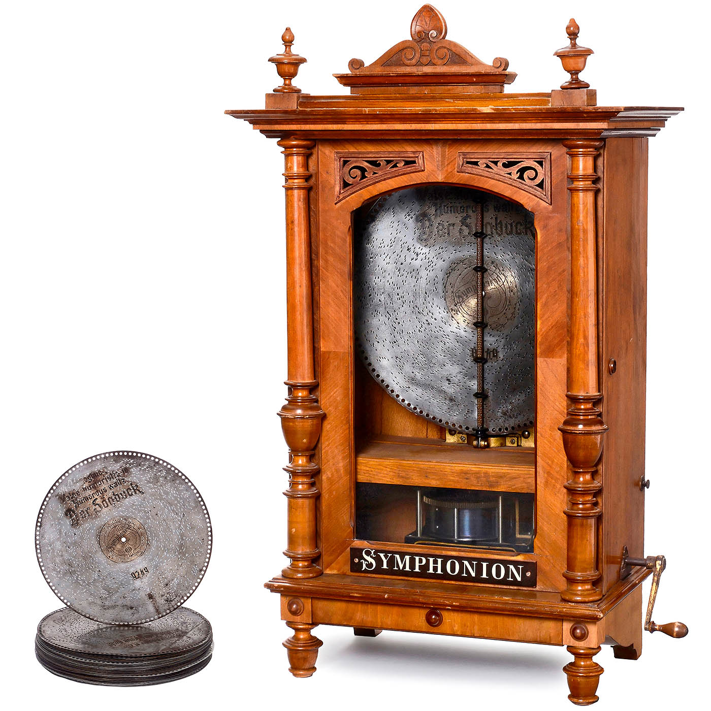 Symphonion Musikwerke, Leipzig. For 19 1/8 in. discs, 106 teeth in duplex music comb (complete), original without coin slot, in carved walnut case with glazed door, replacement pediment, mechanism cover and drawer, height 43 in., with crank and 32 discs in stand. Good playing condition. – With 2 original Symphonion documents.