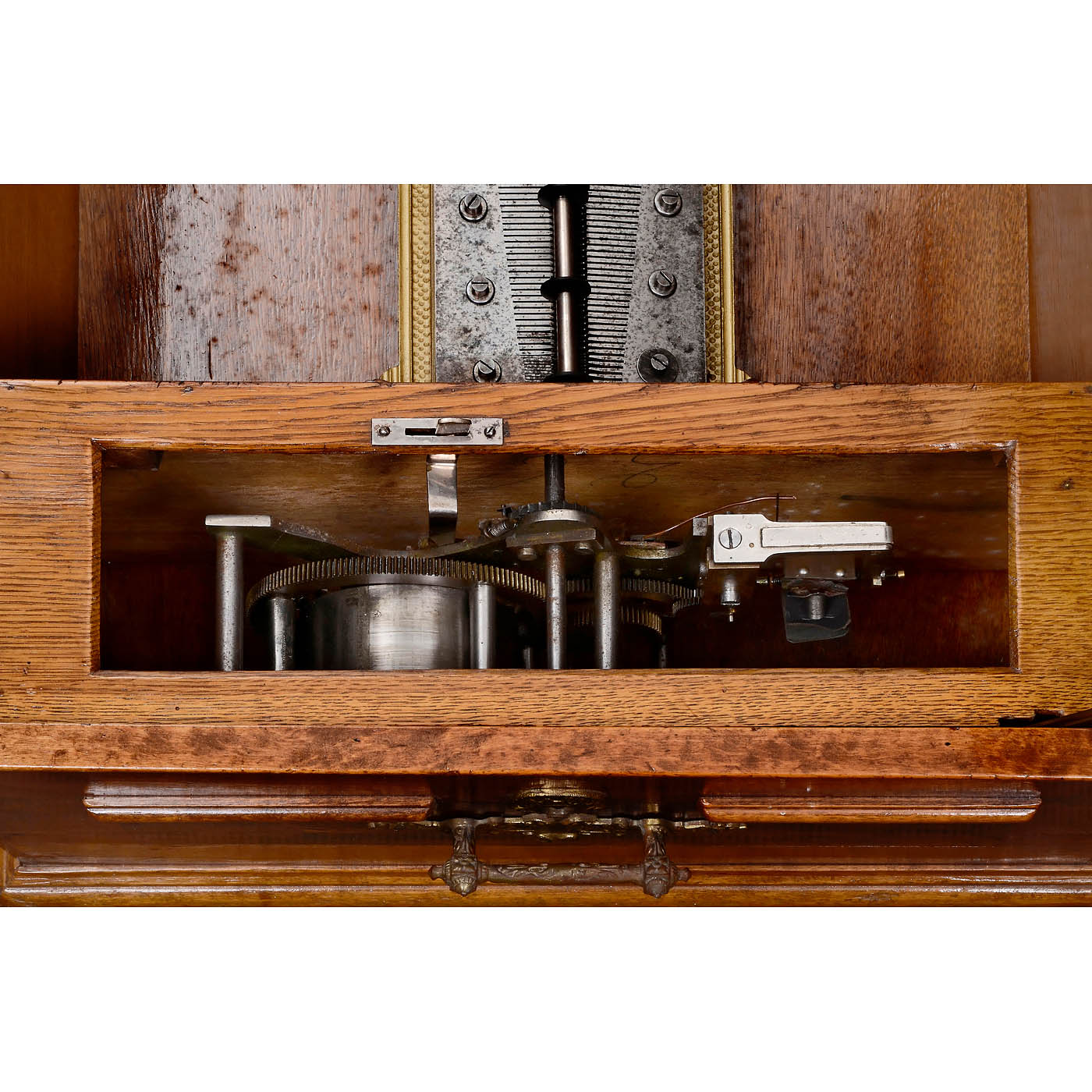 Musikwerke Orpheus Ludwig & Co., Leipzig. For 18 ? in. discs, 128 teeth in double steel comb (complete), treble notes with additional comb and narrow star wheels for a bell-like sound, visible spring motor, colorful underlid lithograph depicting Neptune, walnut case (split in lid), bronze handles, new crank, dampers in need of minor regulation, otherwise in good playing condition, with 5 discs.