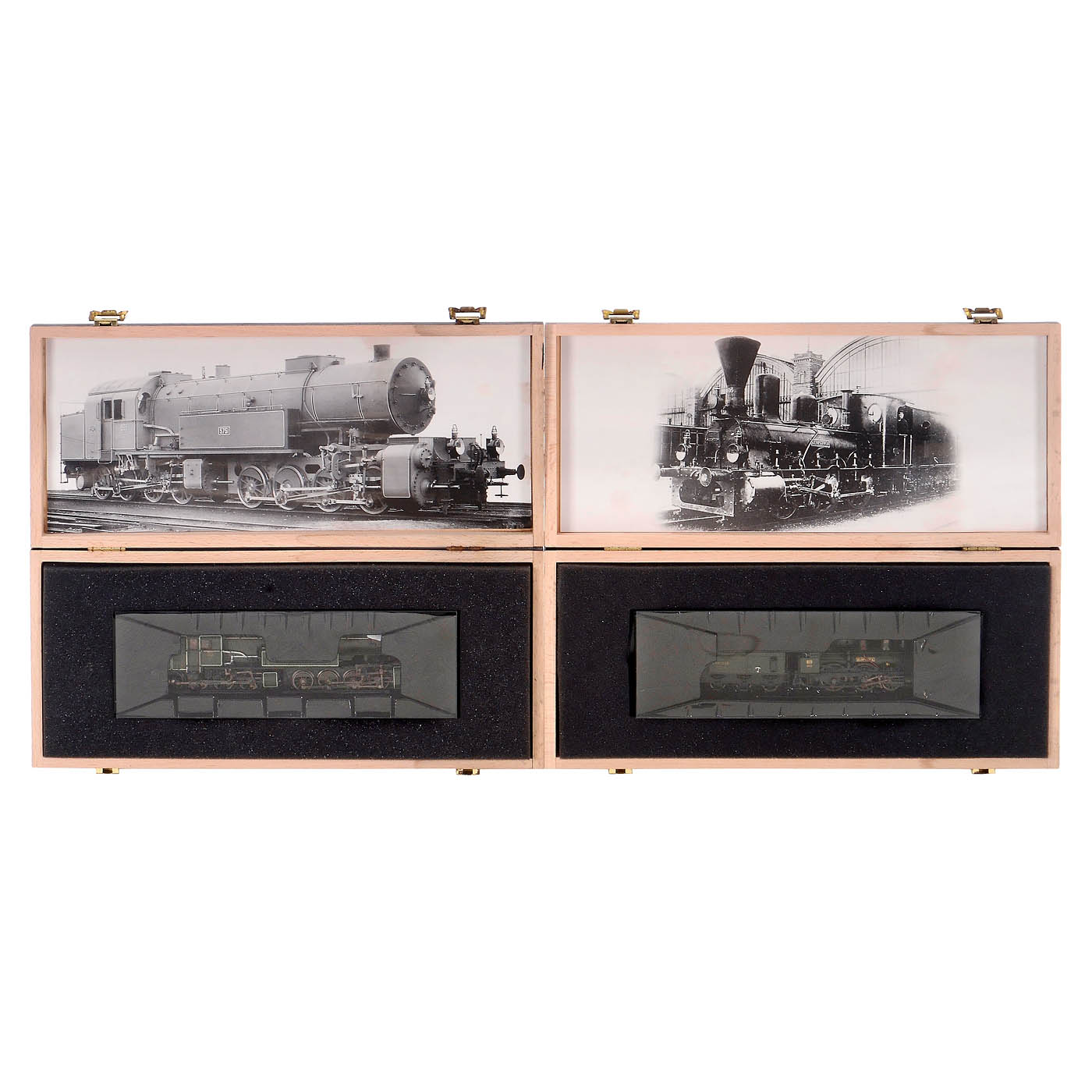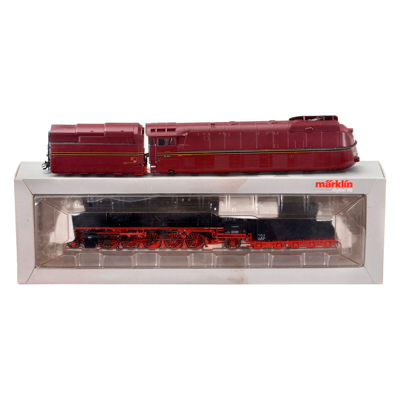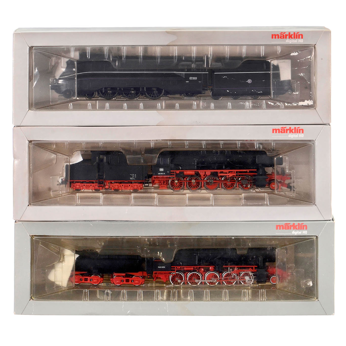 1) No. 37159, SZD class TE-3915 steam locomotive, ex class 52, tank tender. – 2) No. 37914, class 03.10 steam locomotive with streamlined body, version for use in front of special trains of the United States Transportation Corps (USTC) in Germany. – 3) No. 37841, class 051 steam locomotive with cab tender, Telex coupling. – 4) No. 37050, DRG class 05 streamlined steam locomotive, full paneling, with steam locomotive running sound and whistle. – 5) No. 37450, DB class 45 steam locomotive, with sound. – 6) No. 37964, Bavarian Mallett Gtl 2 x 4/4, heavy freight locomotive of the K.bay.Sts.B., special model to mark the 200th anniversary of the Kingdom of Bavaria. – And: 7) No. 37974, K.Bay.Sts.B. class B VI steam locomotive, peat-fired version. – Packaging badly damaged, locomotives in good condition but untested.