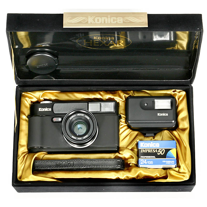 Konica, Japan. 35mm-autofocus camera, Hexar 2.0/35 mm, flash HX-14, strap and instruction manual. With box.