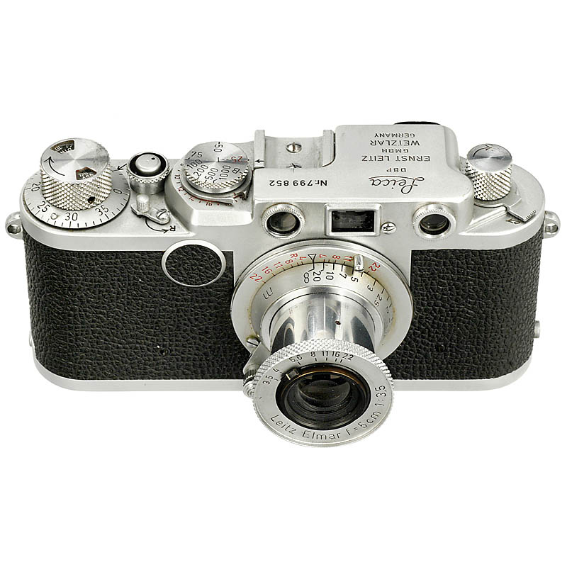Leitz, Wetzlar. No. 799852, third version with red sync scale numbers, and 1/1.000 sec. Elmar 3,5/5cm, red scale, coated, with lens cap. – Mint condition!