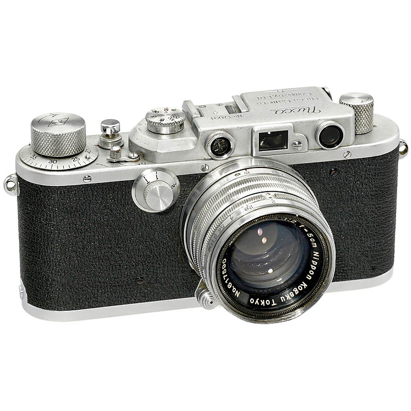 Nicca Camera Works, Japan. No. 37091, no flash synchronization, late version with film plane indicator engraving. Second shutter curtain rippled. With Nikkor-H 2/5 cm and original case.
