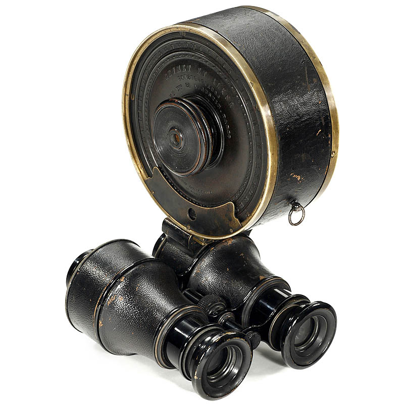 Jumelle de Nicour,双筒望远镜式相机,巴黎 Geymet & Alker 约 1867年制造,序列号:147。由Nicour发明,为摄影史初期少见的望远镜式照相机, 带一个可更换的鼓式片匣, 可放50片40 x 40mm的干版火棉胶底片。左侧的镜筒里面有对焦屏和供精确调焦用的放大目镜,右侧的镜筒起拍摄的作用。相机只需转动180度就可以完成底片的更换。拍品为未经过整修的原始状态。是一件真正意义上具有收藏价值的的罕见的经典古董相机!