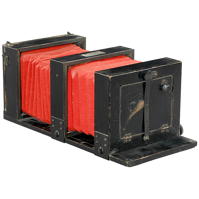 W. D. Kuehn, Berlin (founded in 1910, this company made mostly microscopes and only some cameras!). Passport photo multiplying camera with 13 lenses, for plates with size 9 x 12 cm, red bellows, black precious wood, "D.R.P." plate. – Very rare camera! Museum piece! – Literature: Abring I, no. 812.