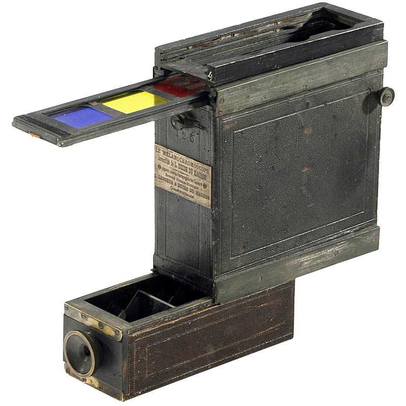 L. Le Sueur & Louis Ducos du Hauron, Paris. Early version of this rare three-color camera for 50 x 130 mm film plates by the "inventor" of color photography, Ducos du Hauron. Exposure via 45° mirror and three separated chambers. Three sequent exposures necessary using the special filter kit (attached!). Fixed focus lens. Body no. 125. – Literature: 1) R. Lécuyer, "Histoire de la Photographie", Paris 1945, p. 242. – 2) Michel Auer, "Kameras gestern und heute", 1975, p. 244/5. – 3) McKeown's Price Guide, 2005/06, p. 620. – A spectacular collector's item of high museum quality. Unrestored original condition!