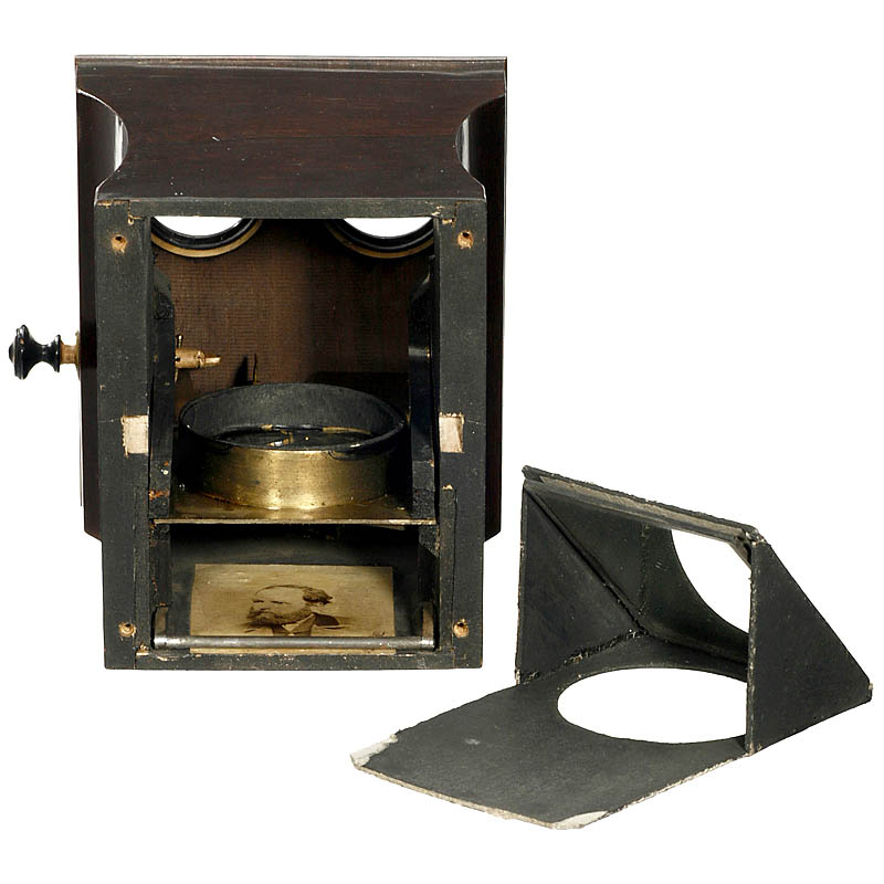 Patented French viewer for creating distorted images from normal photographs, by Jules Duboscq, Paris. Named after the Greek word "grimatsa" (French "grimace" or English "grin"). After winding, a springmotor rotates a distorting glass disk and the viewer presents various humorous and grotesque distortions of the image. – Height: 5 in. – This extremely rare viewer is one of the precursors of the so-called "Photographic Transformists" which Louis Ducos du Haurdon described in 1889! – Literature: 1) Aaron Scharf, "Art and Photography", 1975, p. 233 ff. – 2) Paul Wing, "Stereoscopes", 1996. – Only 2 other examples are known worldwide!