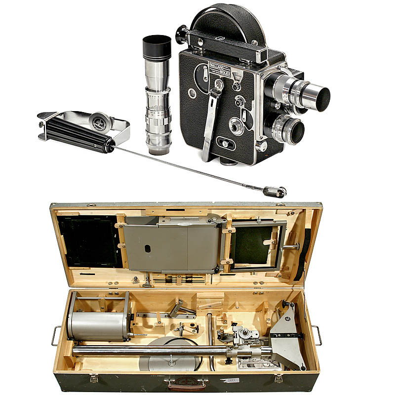 1)Bolex H16, clockwork, 3-lens turret with Schneider 1:1,6/16 mm, 1:1.5/25 mm, 1:3.8/75 mm lenses and 1:4,5/150 mm lens, with original Bolex box and grip.