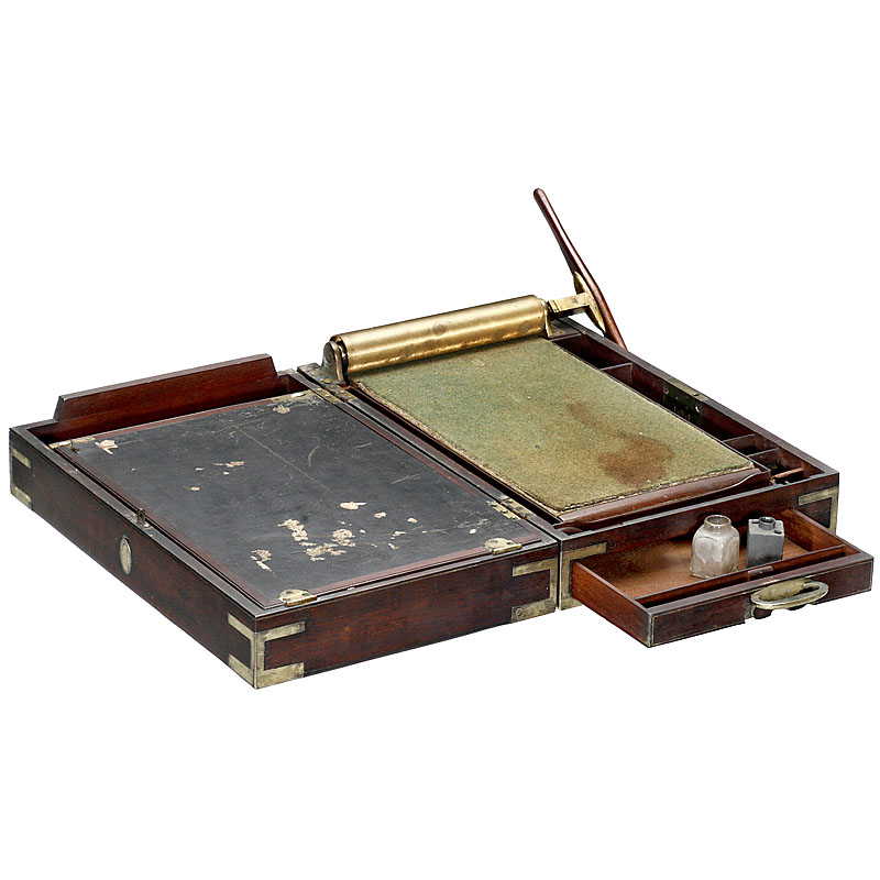 Underneath the writing pad were compartments for pencils, pens, rulers and paper, as well as a special compartment (the "damping box") which was used for treating