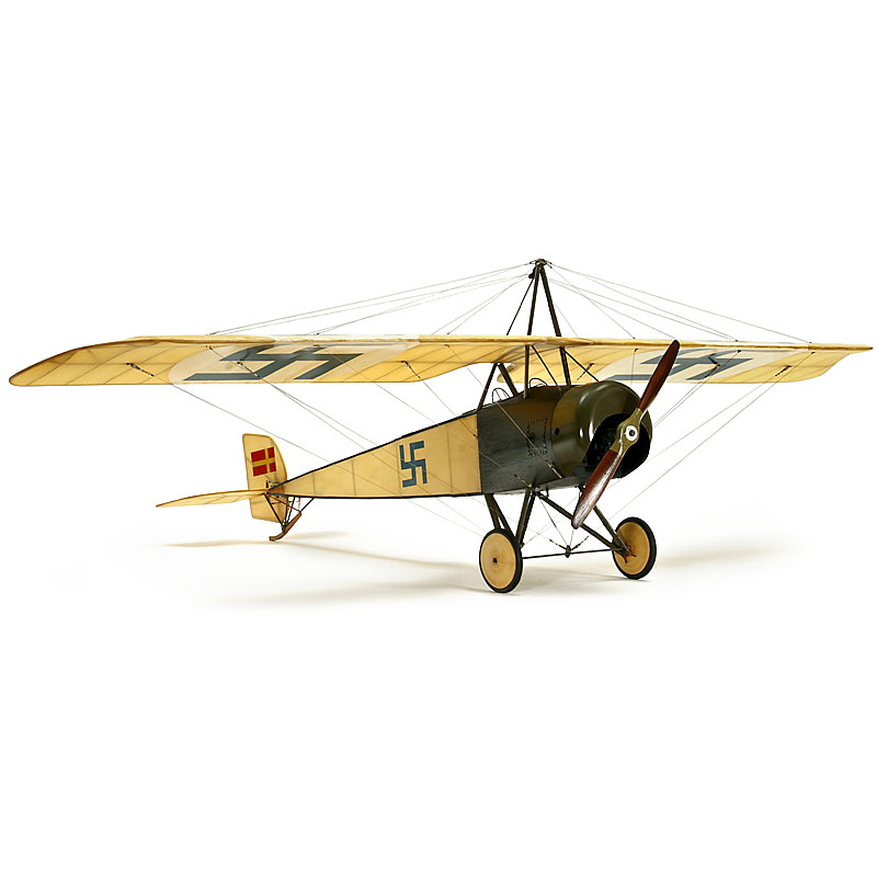 A well-built flying scale (1:6) model of the Swedish military and training airplane from 1917, fabric covered wooden airframe, with the Finnish military markings from 1918–1945, glow-plug engine, with working flying control surfaces, on rubber tyres, 86 in. wingspan (!!).