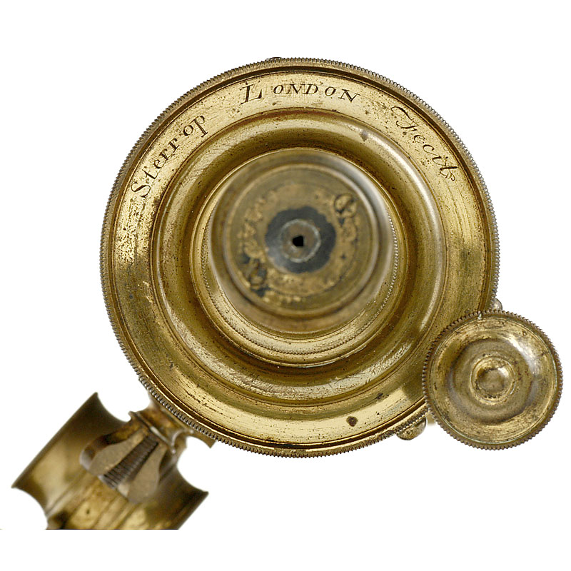 Signed on the eyepiece: "Sterrop London Fecit", lacquered brass, on baluster-turned pillar support and folding cabriolet legs, with screw rod adjustment, tube Ø 2 ½ in., height: 14 1/5 in., with dust cup and wooden box. Good working condition.