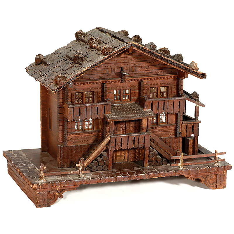 50-tooth cylinder movement playing two airs, the chalet roof starting the movement and revealing velvet-lined movement bay interior, fine detail to the case with typical roof tiles, windows, doors, balconies, steps to entrance and wood store. 11 in. (28 cm) wide.