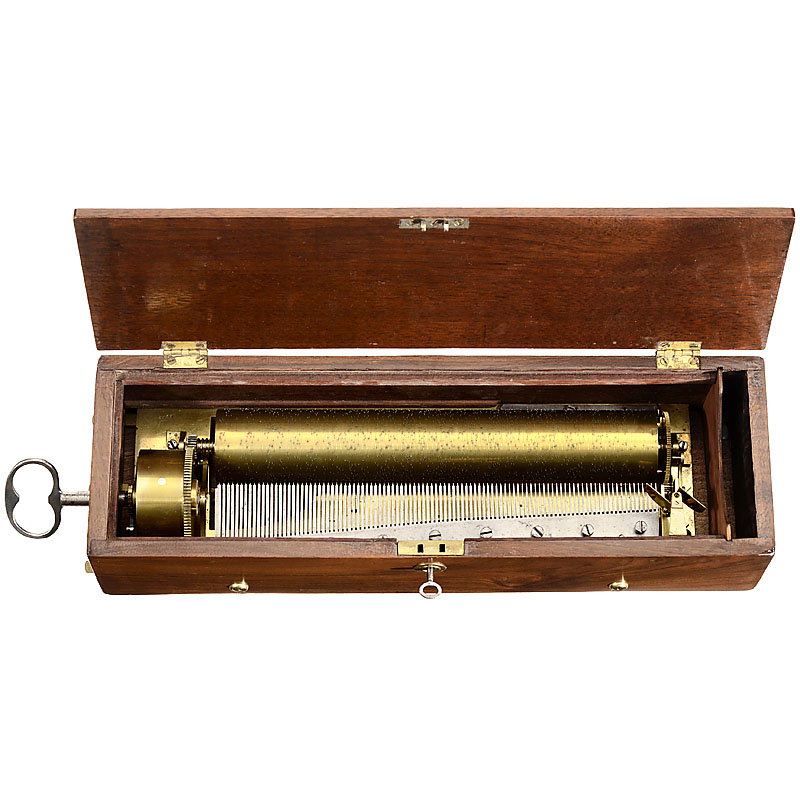 No. 8807, probably Lecoultre, playing six airs, with 102 teeth in comb (complete), washerless comb screws, instant stop, and plain polished walnut case with external controls, width 15 ½ in. (39 cm), cylinder 10 ¼ in. (26 cm), some damper squeaks. Overall an early musical box with beautiful arrangements, in good playing condition.