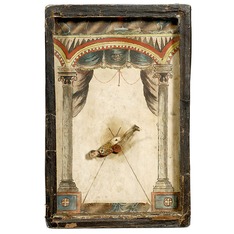 Probably English, home-built, with hand-painted paper background and articulated figure, who somersaults when the toy is turned over, in glazed wood case, decorated with lithographs, 6 ½ x 10 1/8 in. (some losses). – An attractive and early toy!