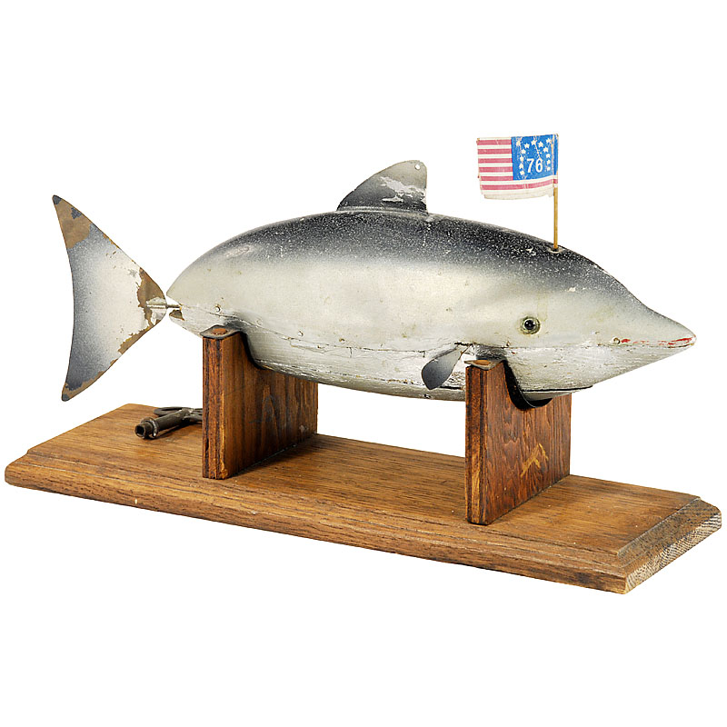 American water toy, manufacturer unknown, clockwork (working) for the motion of the tail, wooden bottom, top and fins of tin.
