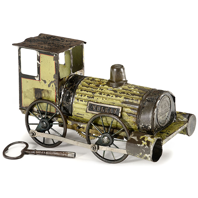 With manufacturer's label on the front: "Blechspielwaren Manufactur, M. H. Nürnberg", hand-painted tin, cast-metal spoke wheels (with German patent number 36181 on each wheel), clockwork drive (working!), length: 7 ½ in. – Impressive!