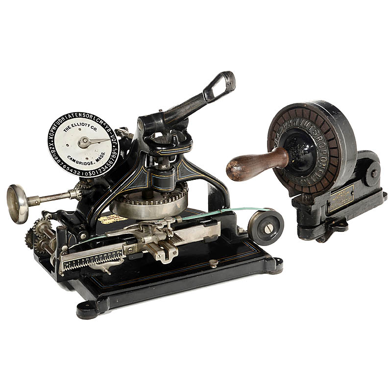 2) "Cummins' Initial Perforating Machine", 1889. Tall and exceptionally early check, shares and document writing machine by "The B. F. Cummins Co., Chicago" that produced later the check writer "Chicago". – Absolutely original condition. – Very attractive collector's item and exhibition piece! (3/3)