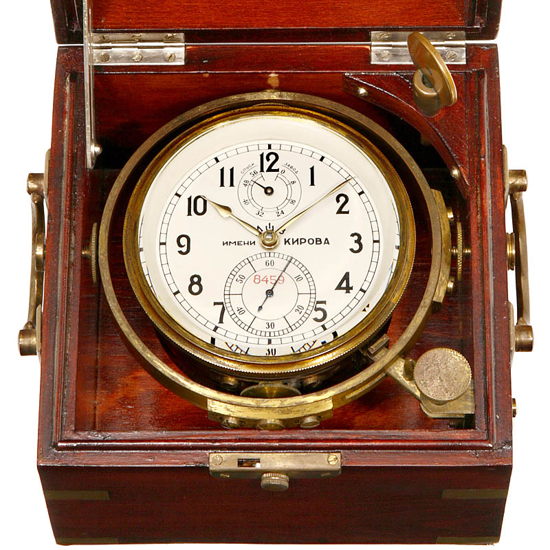 Manufacturer: Moscow chronometer factory "Imeni Kirova", serial no. 8459, three-tier mahogany case with brass fittings, in outer mahogany case, with 2nd dial and up-and-down dial calibrated for 56 hours. – Running.